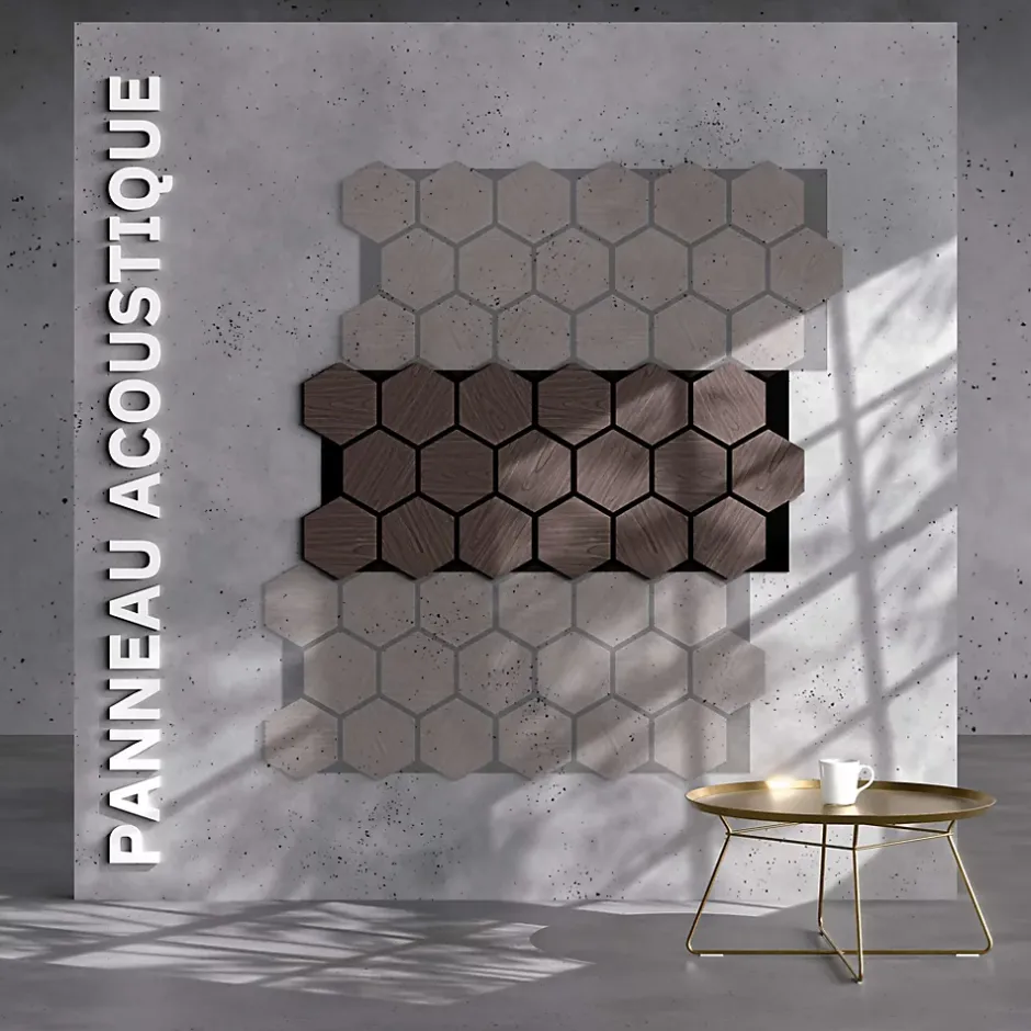 Panneau acoustique hexagonal : le revêtement mural effet nid d’abeille Élevez le style de votre intérieur avec le panneau acoustique hexagonal Noyer. La teinte profonde du noyer, associée à la forme géométrique hexagonale, confère à ces panneaux une allure à la fois sophistiquée et contemporaine. Parfaits pour créer une ambiance chaleureuse et élégante, ces panneaux acoustiques hexagonaux , vendus par lot de 2, apportent une dimension naturelle et raffinée aux murs de vos espaces de vie comme de travail. Chaque panneau mesure 76 x 62 cm et peut être utilisé comme véritable revêtement mural acoustique . Panneau bois hexagone : le mix entre esthétique et acoustique En plus d’être esthétiques, les panneaux bois sont aussi fonctionnels. Ils offrent des performances acoustiques de haute qualité. La feutrine sur laquelle sont fixés les hexagones en MDF possède des propriétés isolantes. Elle absorbe les ondes sonores et atténue la réverbération. Que ce soit pour atténuer les bruits dans un bureau, un salon ou une chambre, le panneau acoustique hexagonal vous assurent une atmosphère plus calme et plus sereine.