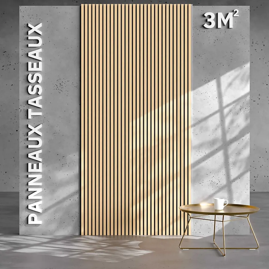 Panneaux tasseaux bois : une déco réussie à coup sûr Vous souhaitez donner du cachet à votre décoration ? Craquez pour les panneaux tasseaux bois Chêne avec feutrine blanche. Esthétique, ce revêtement est idéal pour offrir du relief à une pièce et créer une ambiance moderne, lumineuse, naturelle et cosy, typique des styles de décoration nordiques.Les panneaux tasseaux bois s’adaptent à tous les types de supports, permettant de facilement décorer un mur ou un plafond. Dans la salle à manger, le salon, la chambre ou dans d’entrée, ils peuvent être posés dans toutes les pièces.Esthétiques mais pas seulement, les panneaux tasseaux bois améliorent le confort acoustique intérieur. Grâce aux différentes couches, les panneaux absorbent les ondes sonores et diminuent la réverbération. Ils atténuent les bruits intérieurs, souvent source de stress. Améliorez votre confort acoustique avec les panneaux tasseaux bois Si la feutrine à l’arrière des panneaux tasseaux bois joue un rôle sur l’esthétique globale, elle agit surtout sur le confort et les performances acoustiques. En effet, elle absorbe les ondes sonores, diminue la réverbération et contribue à créer une ambiance propice à la relaxation et à la détente.Les panneaux tasseaux bois sont idéals pour les lieux bruyants ou nécessitant un environnement calme et apaisé. Ainsi, ils peuvent être installés dans un bureau, une salle de réunion, un restaurant, un coin TV ou bien dans toute autre pièce où l’isolation acoustique est importante.