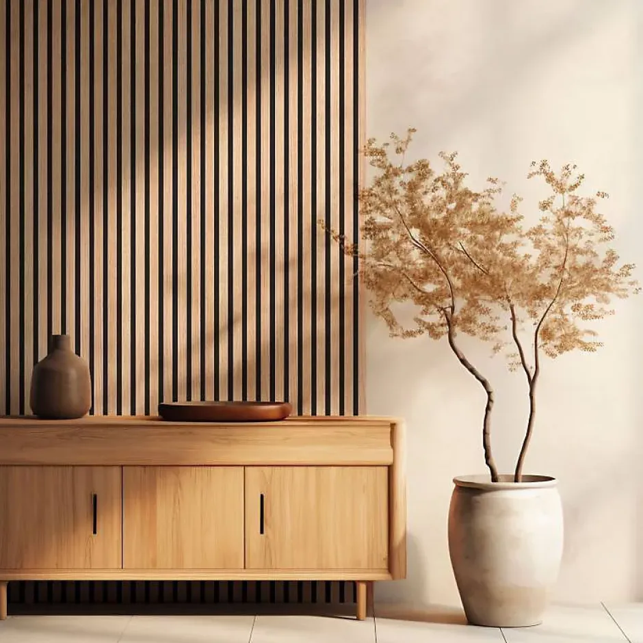 Le mur en tasseau de bois est l’une des dernières tendances dans le monde de la décoration d’intérieur. De plus en plus apprécié par les amateurs de home staging ou les architectes, ils sont désormais accessibles pour tous les amateurs de déco afin de créer un mur TV, une entrée moderne et chic, une tête de lit cocooning ou simplement pour donner une ambiance scandinave design dans votre intérieur.Decoon vous propose une solution tout-en-un, prête à poser avec ce pack produit ultra pratique ! Cette solution de 250 x 30cm d’une épaisseur de 2cm est la solution idéale pour moderniser rapidement et facilement votre intérieur. En un rien de temps, vous apporterez du cachet à votre intérieur tout en créant un décor en tasseaux cosy et chaleureux. Ce pack est composé de 4 panneaux muraux, créant ainsi une surface de 3m2 de 120 cm de long sur 250 cm de haut.Derrière son côté minimaliste et épuré, ce produit est bien plus qu’un simple panneau tasseaux bois : son épaisseur de 2 cm vous offre un confort acoustique amélioré grâce aux propriétés absorbantes de la feutrine. Testée en laboratoire, l’atténuation phonique réduit les effets de résonnance de vos pièces et crée une atmosphère agréable dans votre maison.Présentation du panneau tasseau boisCe panneau est composé d’une feutrine noire et de lattes de bois espacées. Il présente une épaisseur totale de 1 cm : 4 mm d’épaisseur de feutrine et 11 mm d’épaisseur de tasseau. Chaque tasseau présente une largeur de 27 mm avec un espacement de 16 mm avec le suivant. Le panneau de tasseaux bois est de dimensions 250 x 30 cm.Chaque tasseau est composé d’une base en MDF revêtu d’un véritable placage en chêne clair. Il présente une section de 27 x 6 mm.Avantages du mur tasseau bois