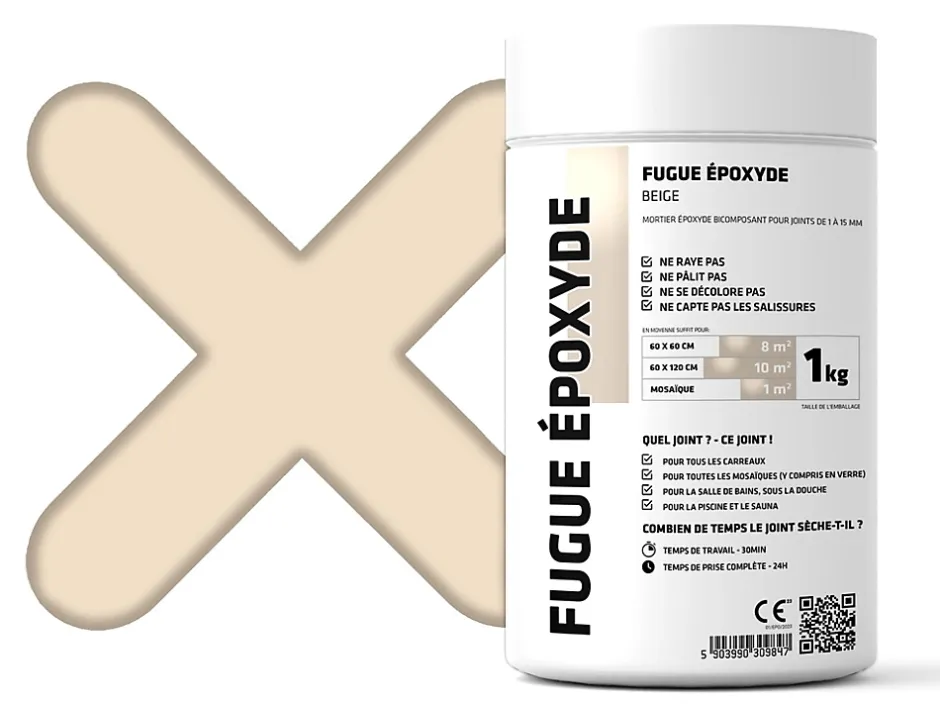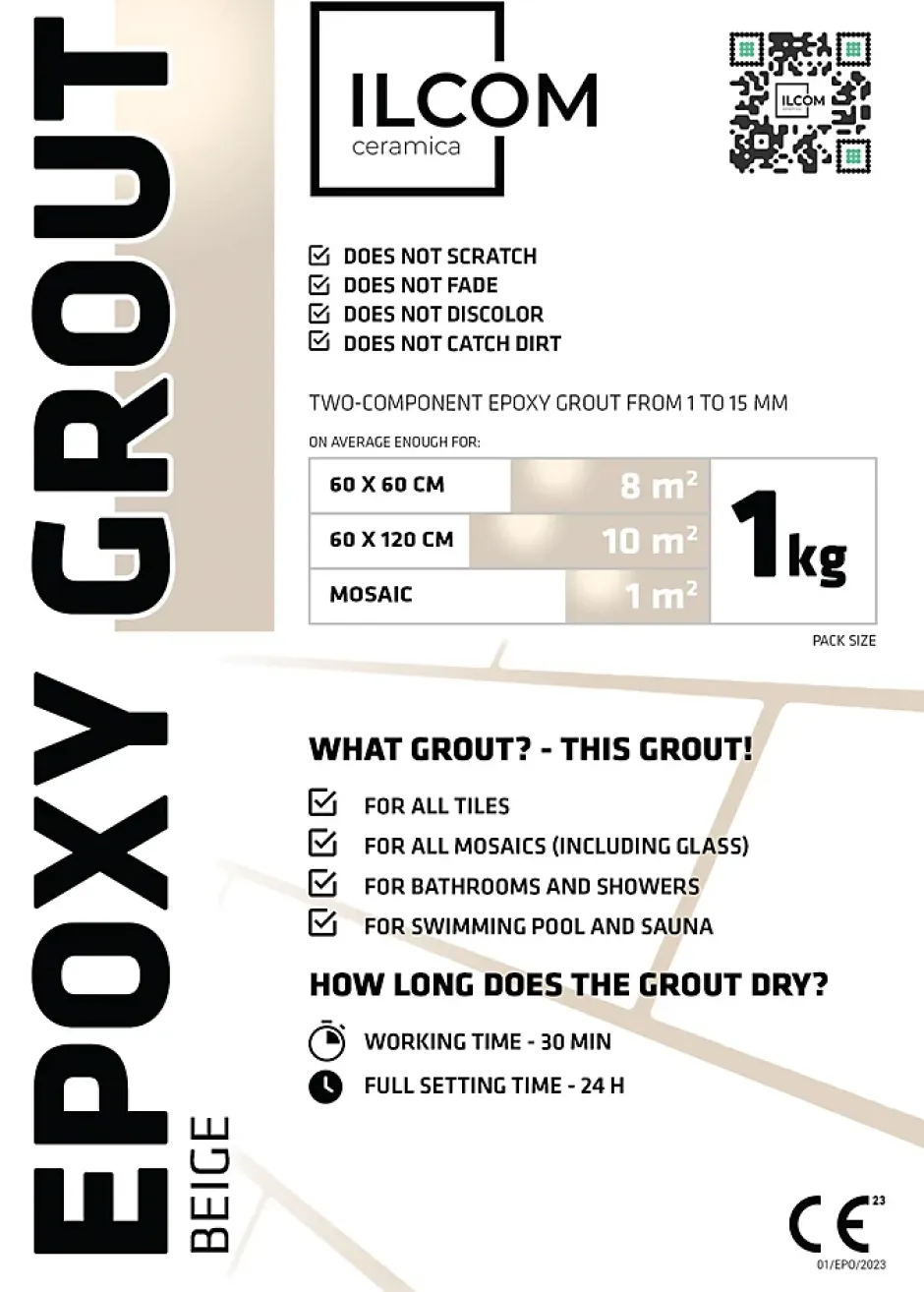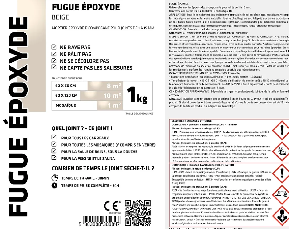 Fuite époxy universelle (mortier époxy) bicomposant pour le remplissage des fuites de 1 à 15 mm. UTILISATION: Pour la fuite des revêtements muraux et de sol, mosaïques, y compris les mosaïques en verre et pierres naturelles. Convient aux zones exposées à des acides, bases, huiles, solvants et eau sous haute pression. Recommandé pour les industries alimentaires et chimiques et les endroits avec des exigences hygiéniques élevées. Imperméable et haute résistance mécanique. MODE D’EMPLOI: Verser complètement le Composant B durcisseur dans le Composant A et mélanger soigneusement pendant au moins 3 min avec un mélangeur à bas régime jusqu’à obtenir une pâte homogène. Respecter strictement les proportions indiquées. Ne pas diluer la fuite avec de l’eau ou des solvants. Appliquer soigneusement le mortier dans les joints à l’aide d’une spatule spéciale en caoutchouc rigide pour les joints époxy. Enlever l’excès de mortier avec la même spatule en diagonale sur la surface des carreaux. Profiler immédiatement après avoir rempli avec le mortier. Nous recommandons d’éliminer l’excès de fuite dans les 15 minutes suivant l’application, en utilisant une éponge pour fuites époxy imbibée de solvant xylène, en effectuant des mouvements circulaires en éliminant l’excès restant sur la surface. Ensuite, avec une éponge ordinaire imbibé également de xylène, en enlevant l’émulsion grasse et finir de profiler la fuite. Rincer au moins 2 fois. Ne laissez pas durcir les résidus sur la surface céramique, leur élimination ne sera possible que mécaniquement. DONNÉES TECHNIQUES: Indiquées sur le manuel d’utilisation. CONSERVATION: Conserver dans un endroit sec et ombragé à des températures comprises entre 5 °C et 25 °C. Ne pas congeler ou surchauffer le produit. S’il est conservé dans les conditions indiquées et dans des emballages scellés, la durée de conservation est de 18 mois à compter de la date de fabrication indiquée sur l’emballage. Conforme à la norme PN-EN 13888:2010 comme RG.
