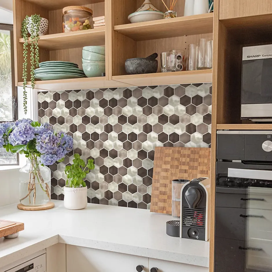 Feuille de mosaïque 30x26cm composée de grands hexagones en aluminium brossé noir, gris et argent