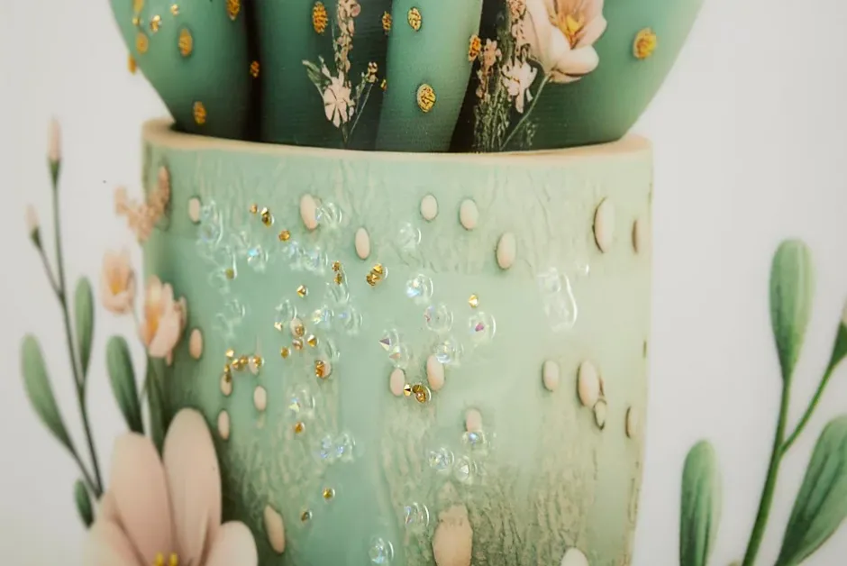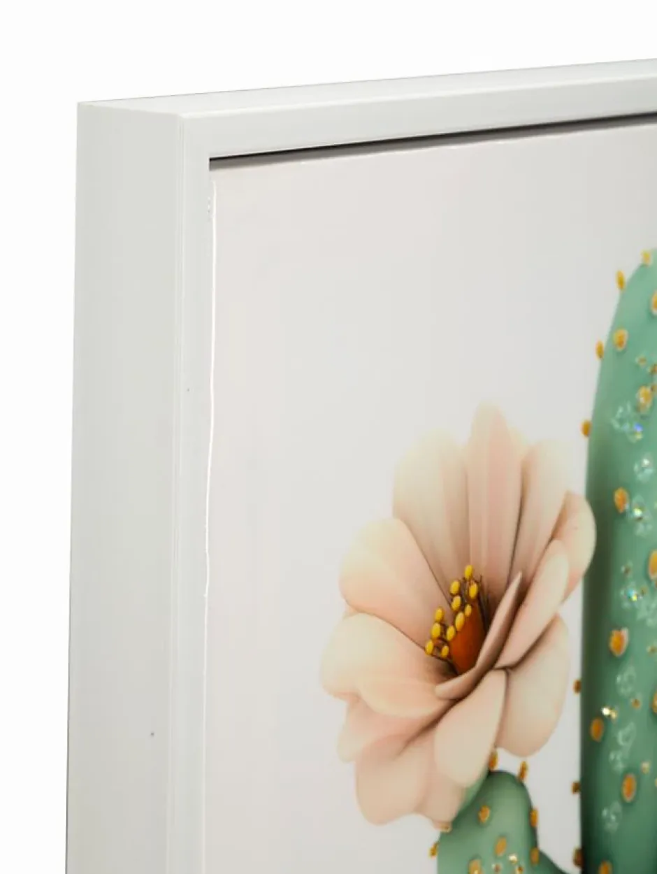 Impression sur toile encadrée de blanc représentant un cactus en fleurs. Avec applications en relief. Dimensions : 40 x 40 x 2,8 cm.
