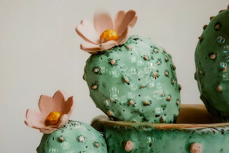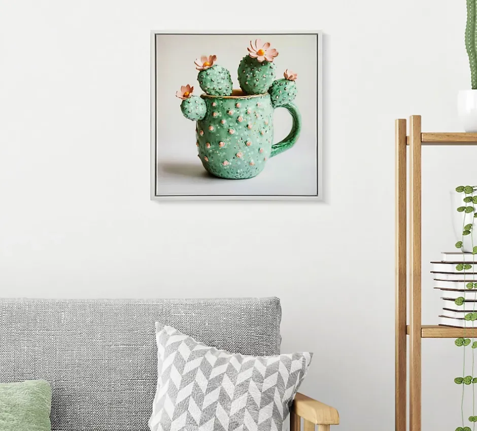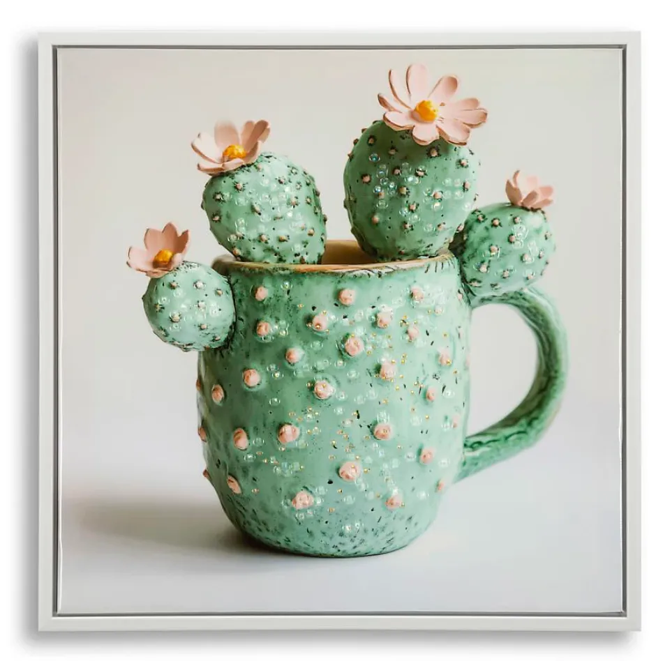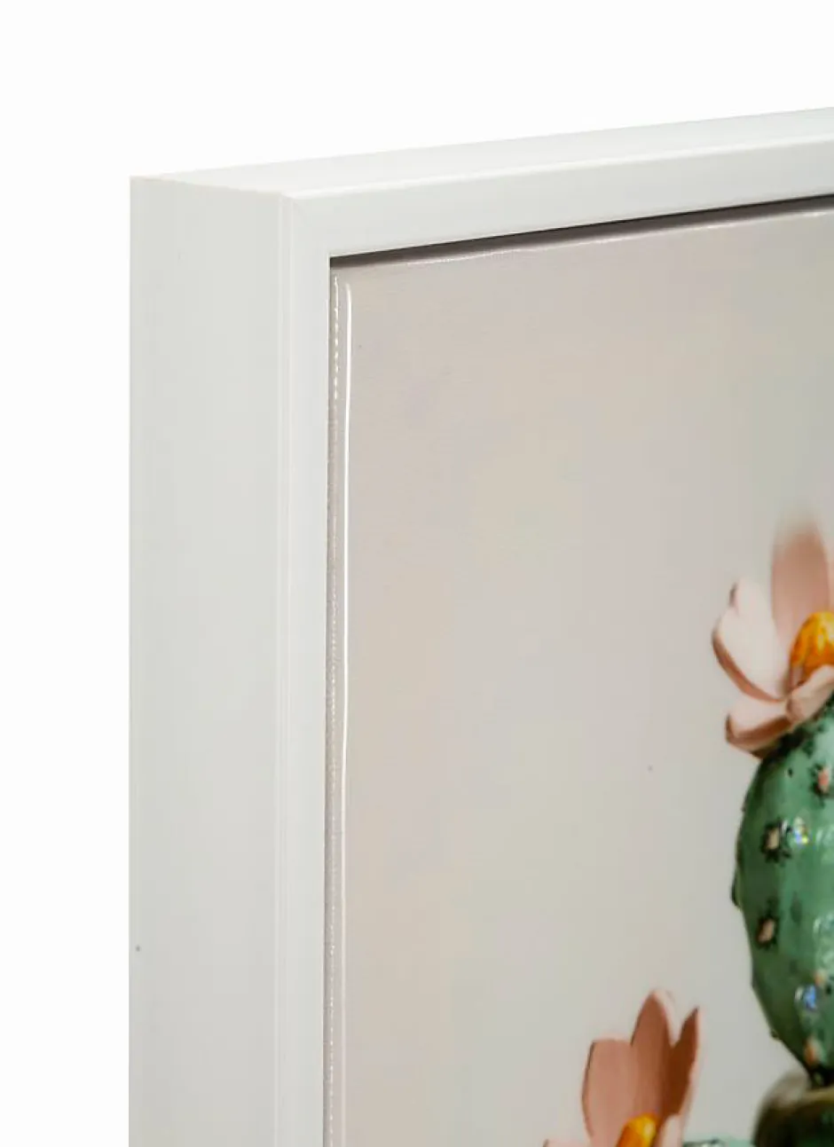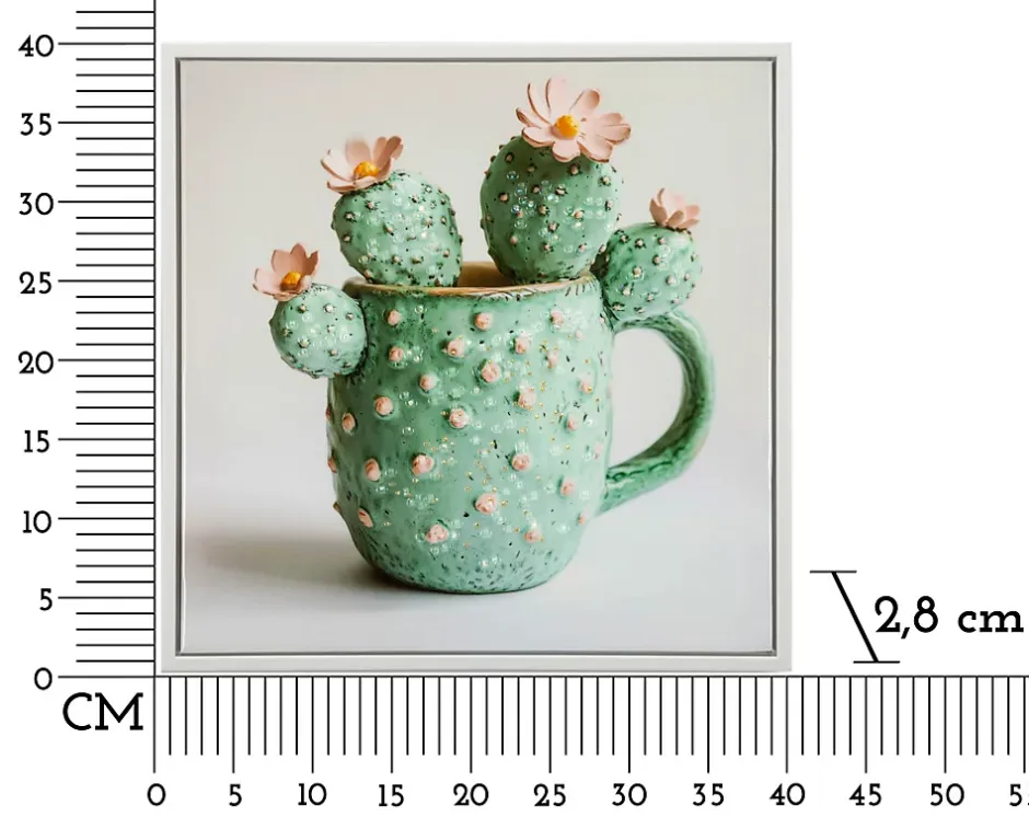 Impression sur toile avec cadre blanc représentant un cactus dans une tasse : un imprimé qui apporte couleur et charme aux murs modernes et aux espaces jeunes. Avec des applications en relief. Dimensions : 40 x 40 x 2,8 cm.