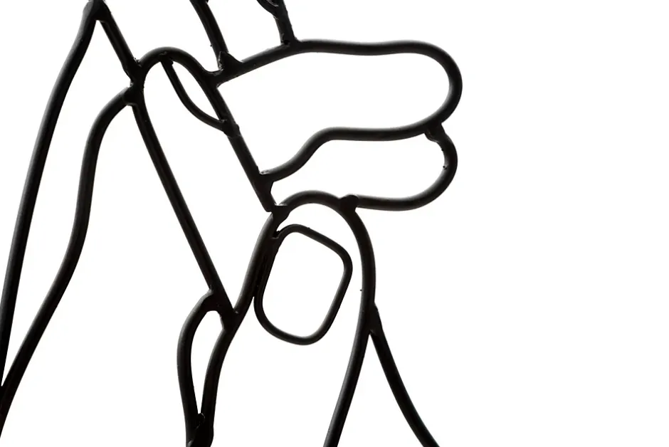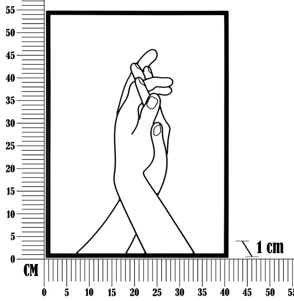 Panneau mural décoratif en métal 3D représentant deux mains stylisées encadrées dans un cadre rectangulaire. Dimensions : 40 x 55 cm, épaisseur : 1 cm.