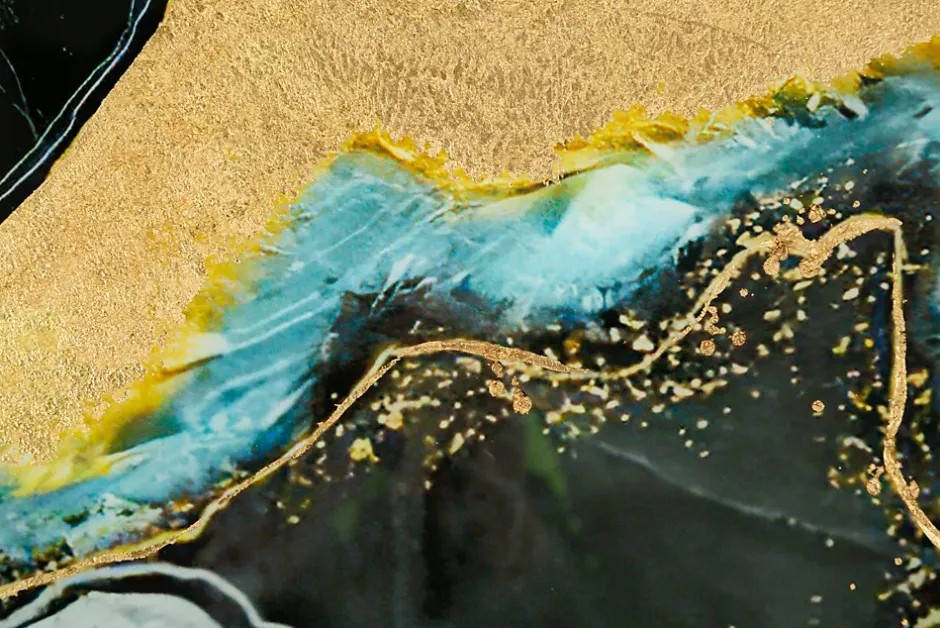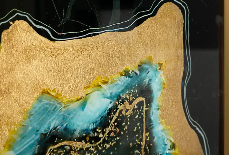 Panneau de verre abstrait avec cadre en aluminium doré. Dimensions : 60 x 90 cm, épaisseur : 3,5 cm.