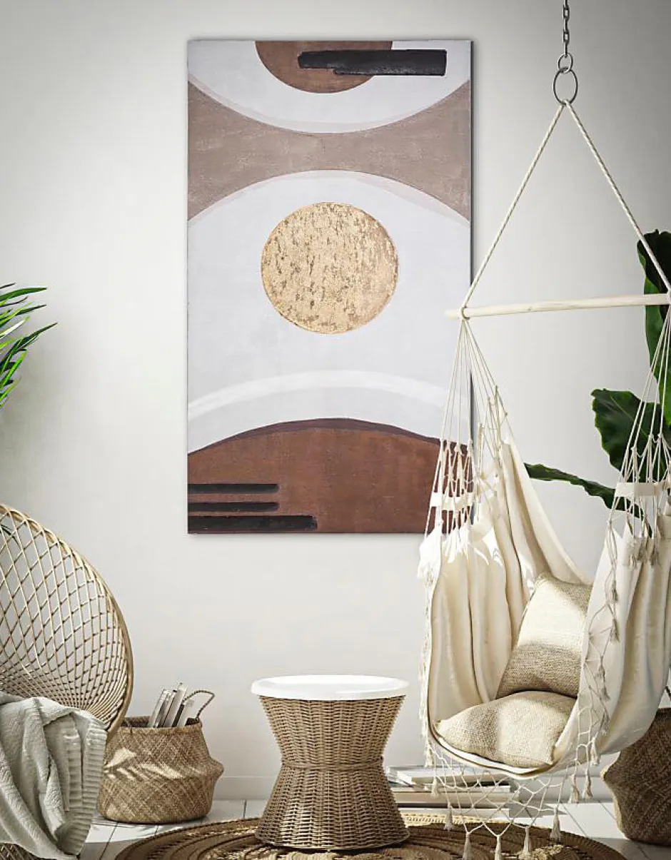 Peinture sur toile encadrée de bois représentant des formes géométriques abstraites qui apportent une touche de couleur à n’importe quel mur. Dimensions : 180 x 100 cm, épaisseur du cadre : 4,8 cm.