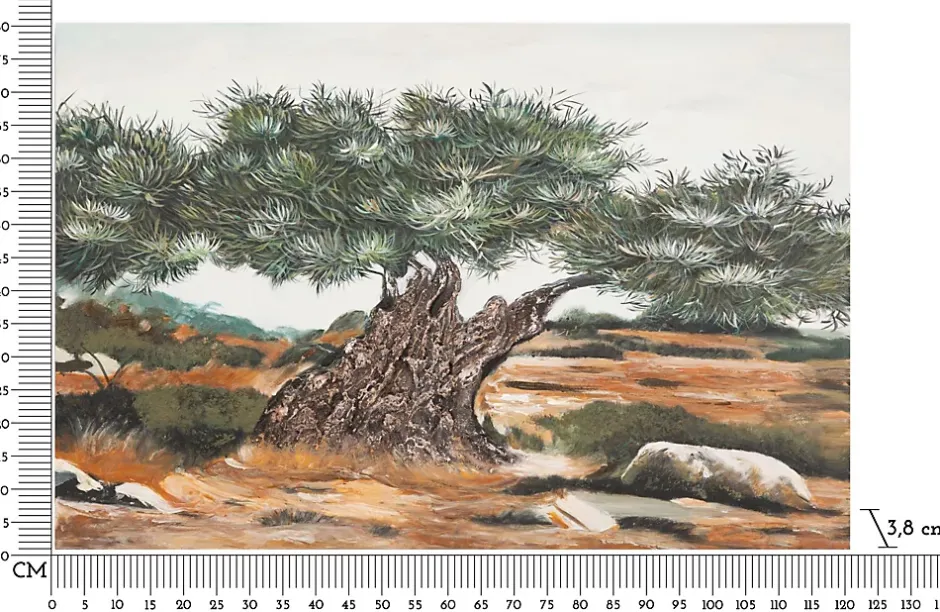 Peinture sur toile représentant un olivier majestueux, sculpté par le vent et l’histoire, qui prend vie au milieu de tons chauds et d’un feuillage vert éclatant. Une œuvre qui évoque racines, stabilité et beauté intemporelle. Avec des applications en relief. Dimensions : 120 x 80 x 3,8 cm.