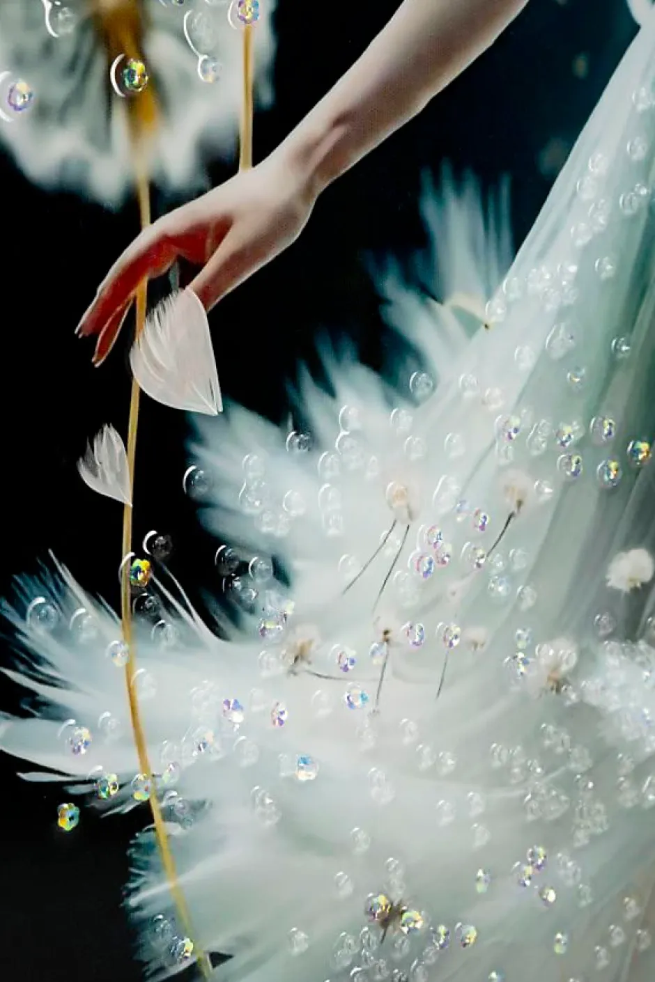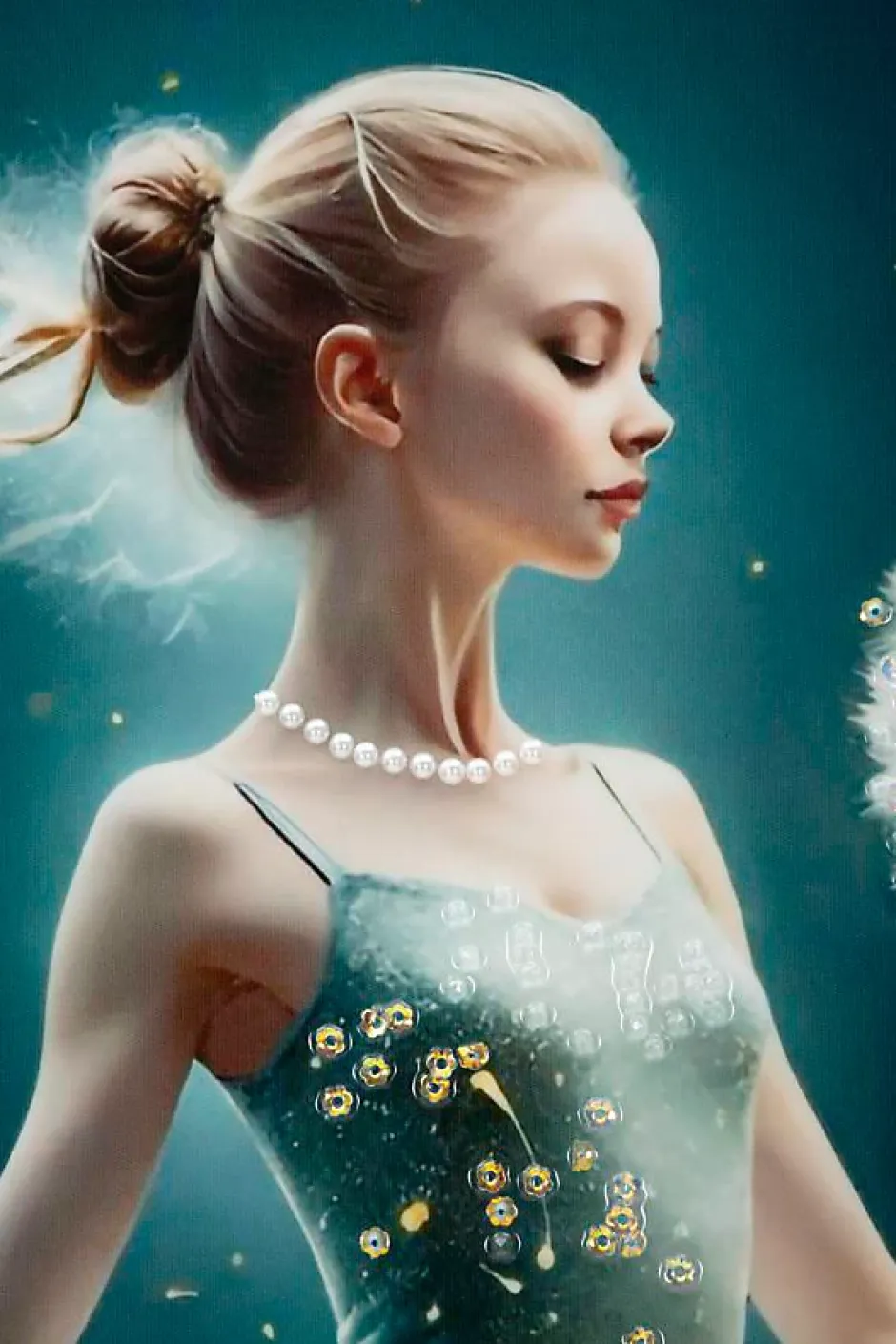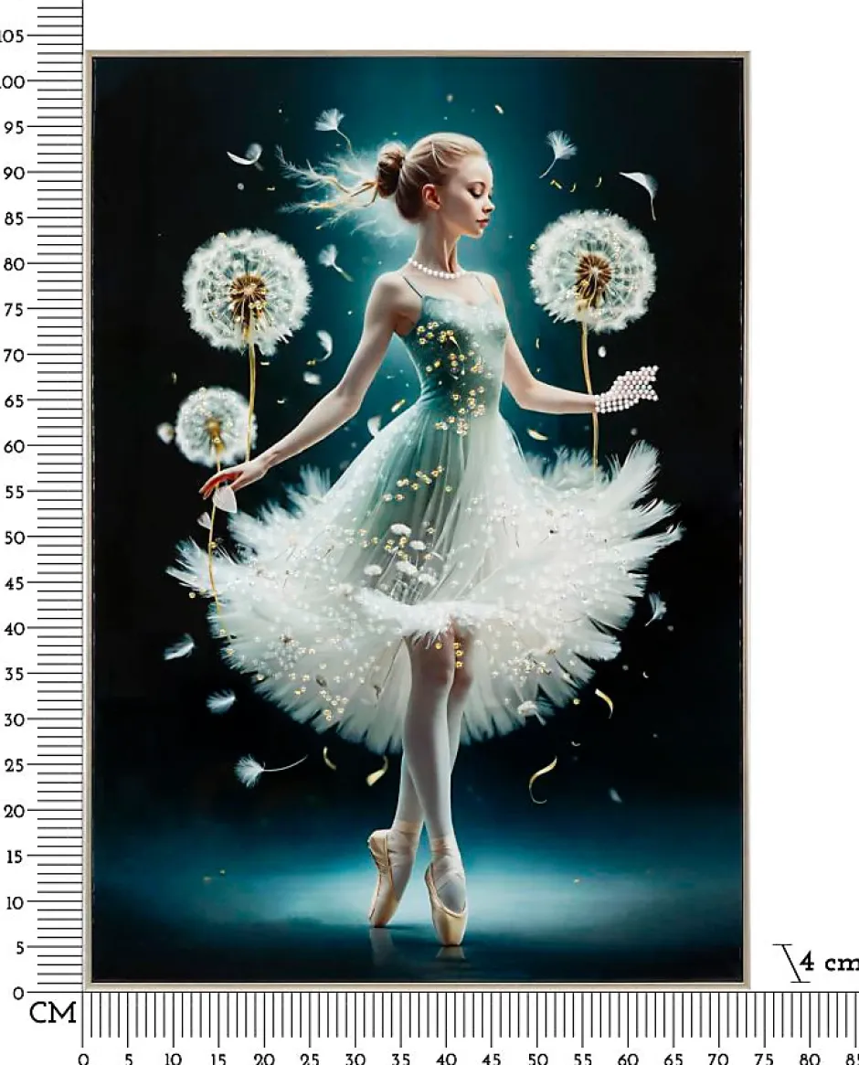 Peinture sur toile montée sur châssis en bois et cadre en métal argenté, exprimant grâce et légèreté avec une touche de magie. La ballerine éthérée, vêtue d’une robe aux douces plumes, danse parmi les pissenlits flottants, évoquant liberté et rêve. Parfaite pour les espaces élégants et raffinés. Avec des applications en relief. Dimensions : 72 x 4 x 102 cm.