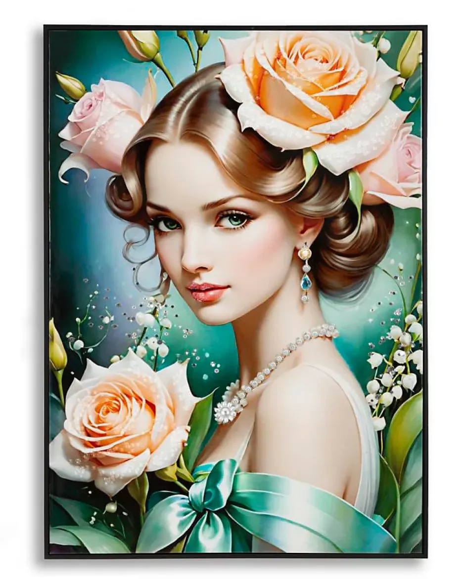 Peinture sur toile, encadrée d’un cadre en bois et d’un cadre en métal noir, elle incarne l’élégance et le charme onirique. Ce portrait féminin, orné de perles et de roses délicates, dégage une aura romantique et sophistiquée. Parfait pour les espaces raffinés, il apporte une touche de magie et de beauté intemporelle. Avec des applications en relief. Dimensions : 72 x 4 x 102 cm.