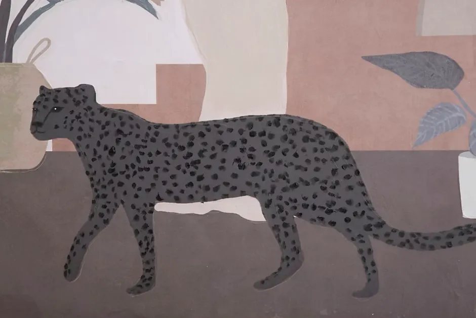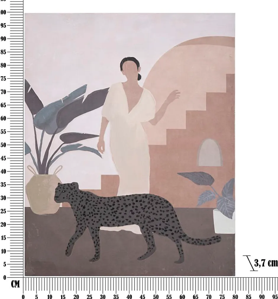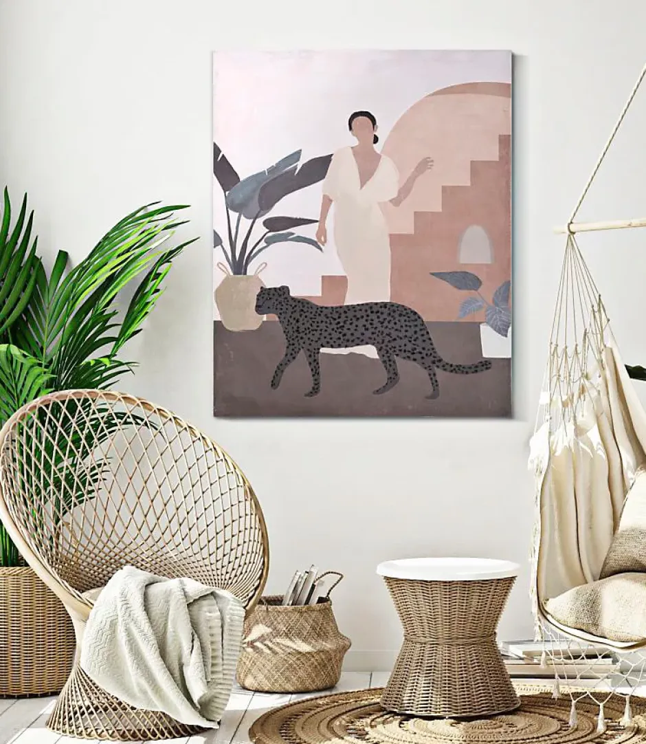 Peinture sur toile encadrée en bois représentant une femme avec un félin. Ses couleurs chaudes apportent une touche de sérénité à tout espace. Dimensions : 80 x 100 cm, épaisseur du cadre : 3,7 cm.