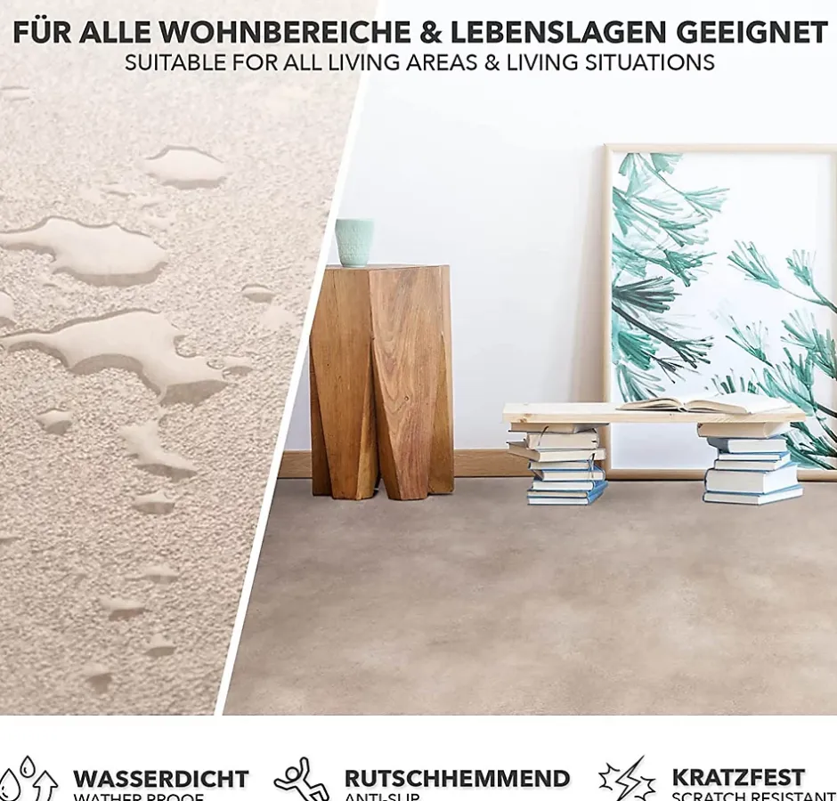 Le revêtement de sol PVC de vous permet de donner du peps à vos quatre murs en toute simplicité et sans grand effort. L’élégant aspect bois gaufré du revêtement confère au sol de votre maison une note individuelle et noble, tout en restant extrêmement facile d’entretien. Sur le plan qualitatif, le sol en vinyle convainc surtout par sa grande résistance à l’usure. Le revêtement de sol en PVC réduit en outre le bruit de roulement et isole du froid. En même temps, il est adapté au chauffage par le sol. Grâce à sa surface fermée, il est très facile d’éliminer les salissures, car un nettoyage humide ou mouillé n’endommage pas le revêtement de sol. Ces propriétés le rendent également idéal pour la cuisine ou la salle de bain. Le produit au mètre peut être facilement découpé sur place, il est lisse dans la pièce grâce à son envers en mousse, sans devoir être collé.