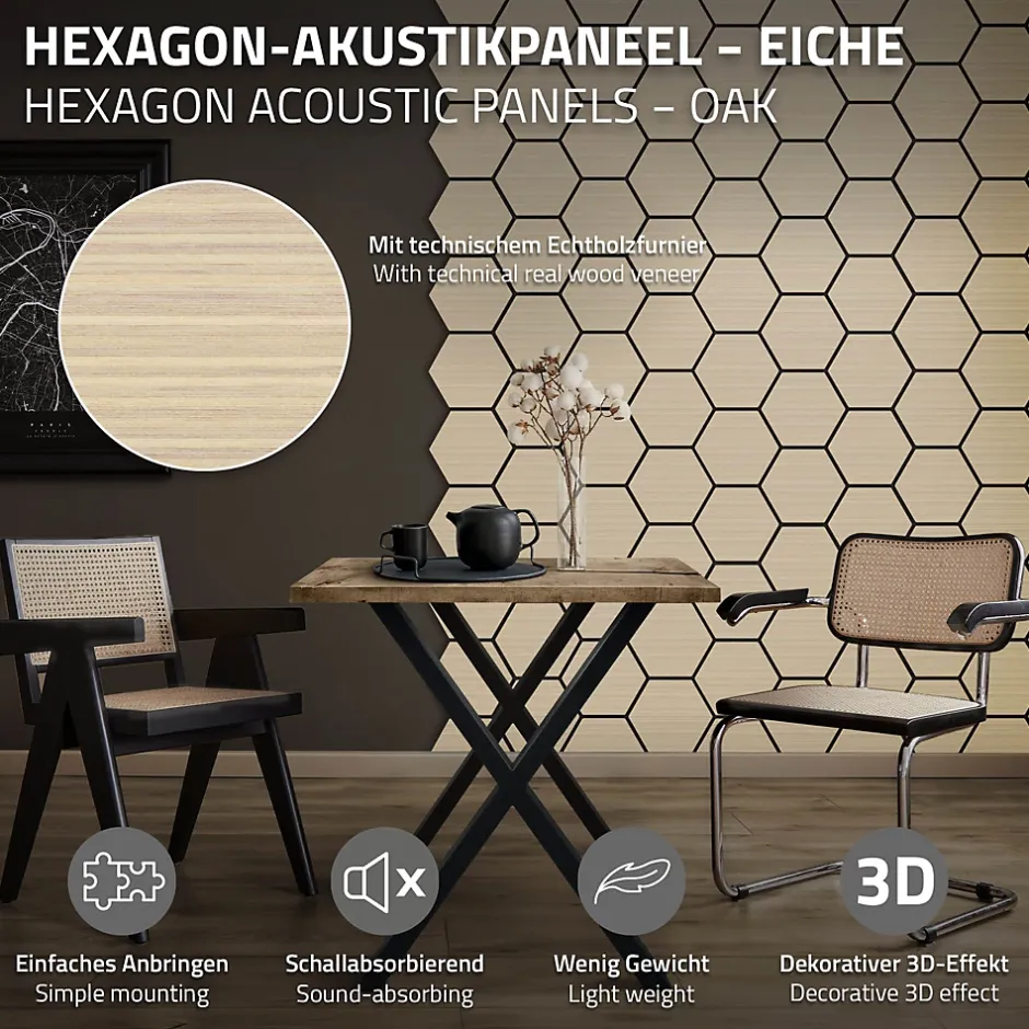 Description:Donnez du style à votre pièce avec nos panneaux acoustiques en nid d’abeille.Ces panneaux acoustiques modernes n’apportent pas seulement le calme dans votre pièce, mais aussi une véritable touche de design à votre mur ! La structure en nid d’abeilles avec un placage en bois élégant rencontre un feutre performant en PET recyclé – idéal pour les salons, les bureaux, les studios ou les couloirs.Vous recevez 9 nids d’abeille par panneau, fixés sur un support MDF solide avec du feutre noir. Grâce à leur conception ingénieuse, vous pouvez installer les panneaux à la verticale ou à l’horizontale , selon la configuration de votre pièce. Qu’ils soient collés ou vissés, l’installation est simple et les panneaux peuvent être facilement découpés si nécessaire.La combinaison de feutre PET haute densité (1350 g/m²) et de MDF assure une excellente absorption acoustique.Vos avantages en un coup d’œil:Panneau acoustique stylé avec 9 alvéoles – réduction efficace du bruit et design moderneMontage facile par collage ou vissage – possible verticalement & horizontalementLivraison:2 x Panneau Chênesuffisant pour une surface d’environ 1 m²