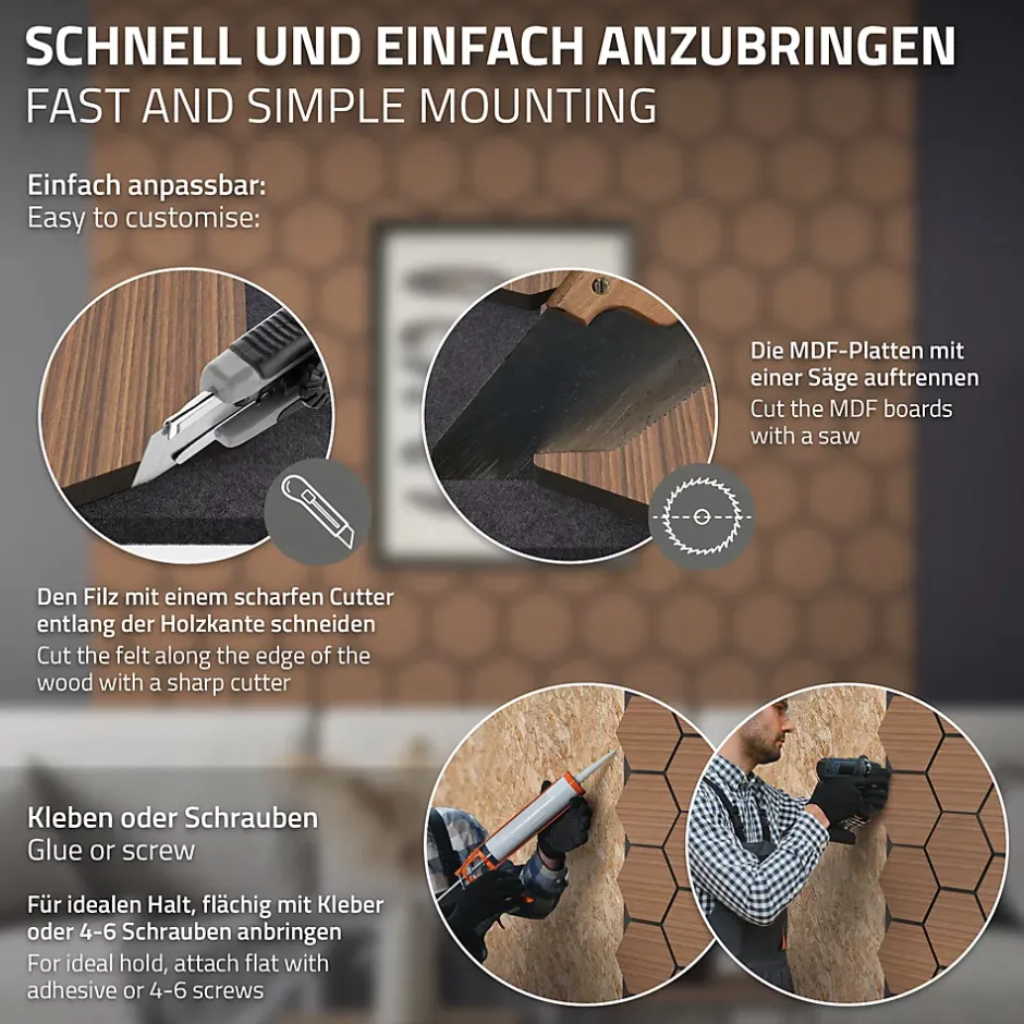 Description:Donnez du style à votre pièce avec nos panneaux acoustiques en nid d’abeille.Ces panneaux acoustiques modernes n’apportent pas seulement le calme dans votre pièce, mais aussi une véritable touche de design à votre mur ! La structure en nid d’abeilles avec un placage en bois élégant rencontre un feutre performant en PET recyclé – idéal pour les salons, les bureaux, les studios ou les couloirs.Vous recevez 9 nids d’abeille par panneau, fixés sur un support MDF solide avec du feutre noir. Grâce à leur conception ingénieuse, vous pouvez installer les panneaux à la verticale ou à l’horizontale , selon la configuration de votre pièce. Qu’ils soient collés ou vissés, l’installation est simple et les panneaux peuvent être facilement découpés si nécessaire.La combinaison de feutre PET haute densité (1350 g/m²) et de MDF assure une excellente absorption acoustique.Vos avantages en un coup d’œil:Panneau acoustique stylé avec 9 alvéoles – réduction efficace du bruit et design moderneMontage facile par collage ou vissage – possible verticalement & horizontalementLivraison:2 x Panneau Tecksuffisant pour une surface d’environ 1 m²