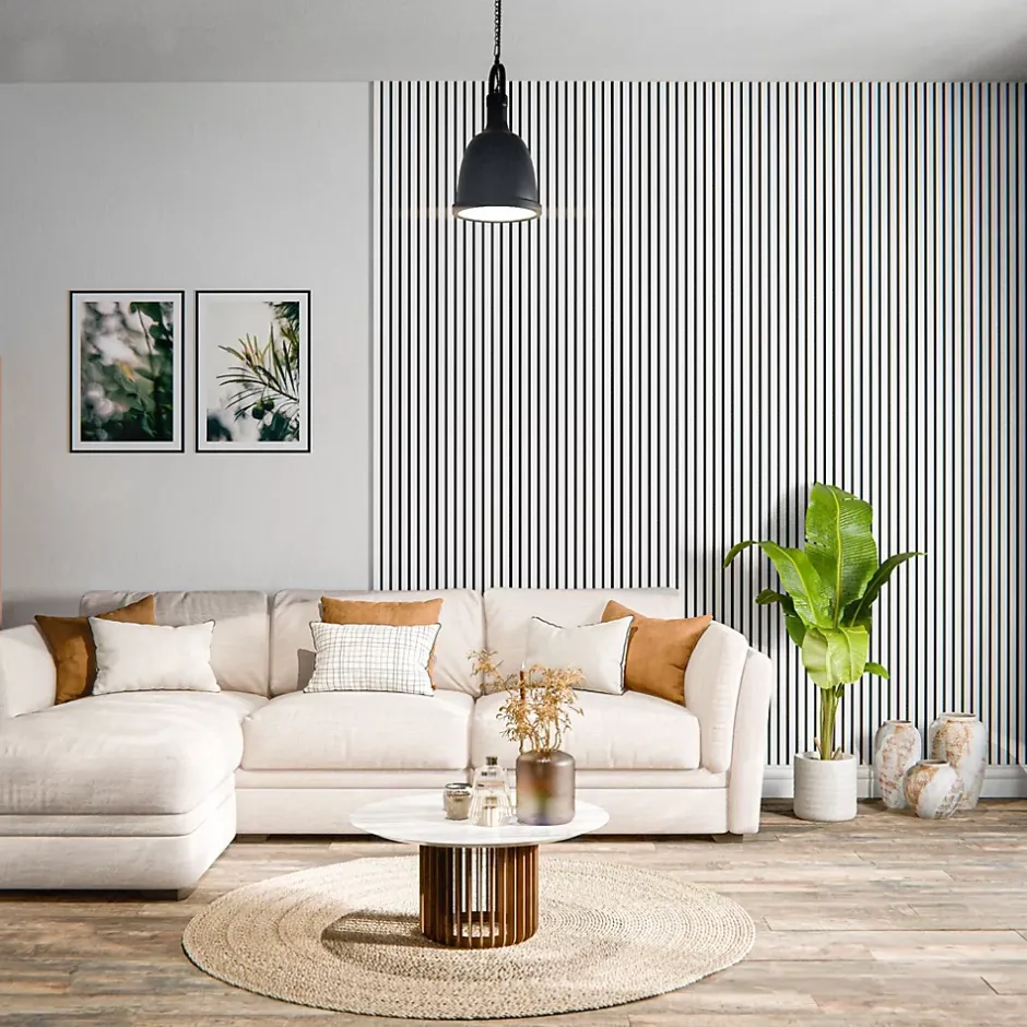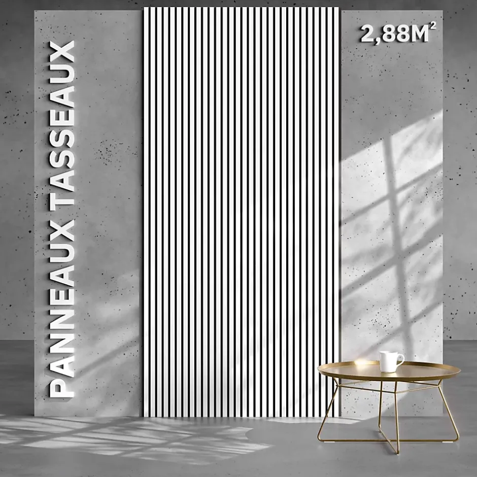 Panneaux tasseaux bois : une déco réussie à coup sûr Vous cherchez une astuce déco à la fois tendance et performante ? Les panneaux tasseaux bois blancs sur feutre noir sont idéals pour pimper votre intérieur et lui offrir un meilleur confort acoustique. Parfaite combinaison de design et fonctionnalité, ces panneaux tasseaux bois permettent de créer une ambiance moderne, chaleureuse et agréable à vivre. À installer sur les murs ou les plafonds, ces panneaux tasseaux bois conviennent à toutes les pièces : salon, salle à manger, bureau, chambre. Faciles à poser, ils permettent d’insuffler un nouveau souffle à votre décoration en temps trois mouvements. Les panneaux tasseaux bois sont esthétiques mais pas seulement. Le feutre sur lequel sont fixés les tasseaux en MDF permettent d’insonoriser et de diminuer la réverbération dans les pièces. Cela améliore l’isolation phonique, rend les conversations plus audibles et réduit le stress. Améliorez votre confort acoustique avec les panneaux tasseaux bois Si la feutrine à l’arrière des panneaux tasseaux bois joue un rôle sur l’esthétique globale, elle agit surtout sur le confort et les performances acoustiques. En effet, elle absorbe les ondes sonores, diminue la réverbération et contribue à créer une ambiance propice à la relaxation et à la détente. Les panneaux tasseaux bois sont idéals pour les lieux bruyants ou nécessitant un environnement calme et apaisé. Ainsi, ils peuvent être installés dans un bureau, une salle de réunion, un restaurant ou bien dans toute autre pièce où l’isolation acoustique est importante.