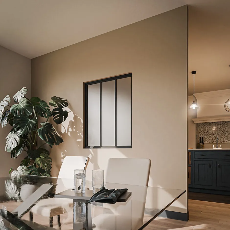La verrière atelier, l’élément phare du style industriel/loft La verrière atelier est un must-have de la décoration style industriel/loft. Avec son cadre métallique et ses vitrages en verre trempé, elle rajeunit un espace et lui donne du cachet. Véritable plus-value dans un intérieur, la verrière atelier est par-dessus tout fonctionnelle, elle permet de séparer des pièces sans les cloisonner et les priver de lumière. Les possibilités d’aménagement avec une verrière atelier sont diverses et variées. Elle peut par exemple servir à délimiter une entrée, à séparer une cuisine d’une salle à manger ou bien à donner de l’intimité à une pièce d’eau. Le verre dépoli donne un effet opaque. Cette particularité garantit une certaine discrétion, empêchant de voir au travers. La verrière industrielle sépare les espaces tout en conservant la lumière À la différence d’un verre classique transparent, un verre dépoli a un aspect translucide qui n’occulte pas la lumière. Aussi pratique que décorative, la verrière atelier 3 carreaux en verre dépoli peut se poser entre cloisons ou entre cloisons mais avec un côté apparent ou en angle. Verre trempé résistant Conserve la lumière naturelle