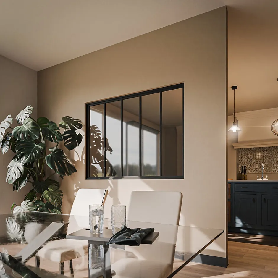 La verrière atelier, l’élément phare du style industriel/loft Apportez une touche industrielle à votre intérieur avec la verrière atelier 5 carreaux noir mat. Typique du design factory, elle répond aux besoins d’espace et de luminosité. Avec ses montants fins en acier et ses vitrages en verre trempé, elle s’inscrit dans la tendance déco du moment.Cette verrière grand format permet de cloisonner les pièces tout en gardant une grande source de lumière. Elle existe en coloris noir mat ou blanc, de 2 à 5 carreaux, en verre transparent ou dépoli, multipliant les possibilités d’usage : séparation de la cuisine avec le séjour, délimitation d’une entrée, etc… La verrière industrielle sépare les espaces tout en conservant la lumière La verrière atelier est autant appréciée dans les intérieurs car elle permet de conserver la lumière extérieure que ce soit avec un vitrage transparent ou dépoli. Visuellement esthétique, elle apporte une sensation de confort, de bien-être et atténue les bruits et les odeurs de la maison. Elle peut se poser entre cloison, avec un côté apparent ou en angle. Verre trempé résistant Conserve la lumière naturelle