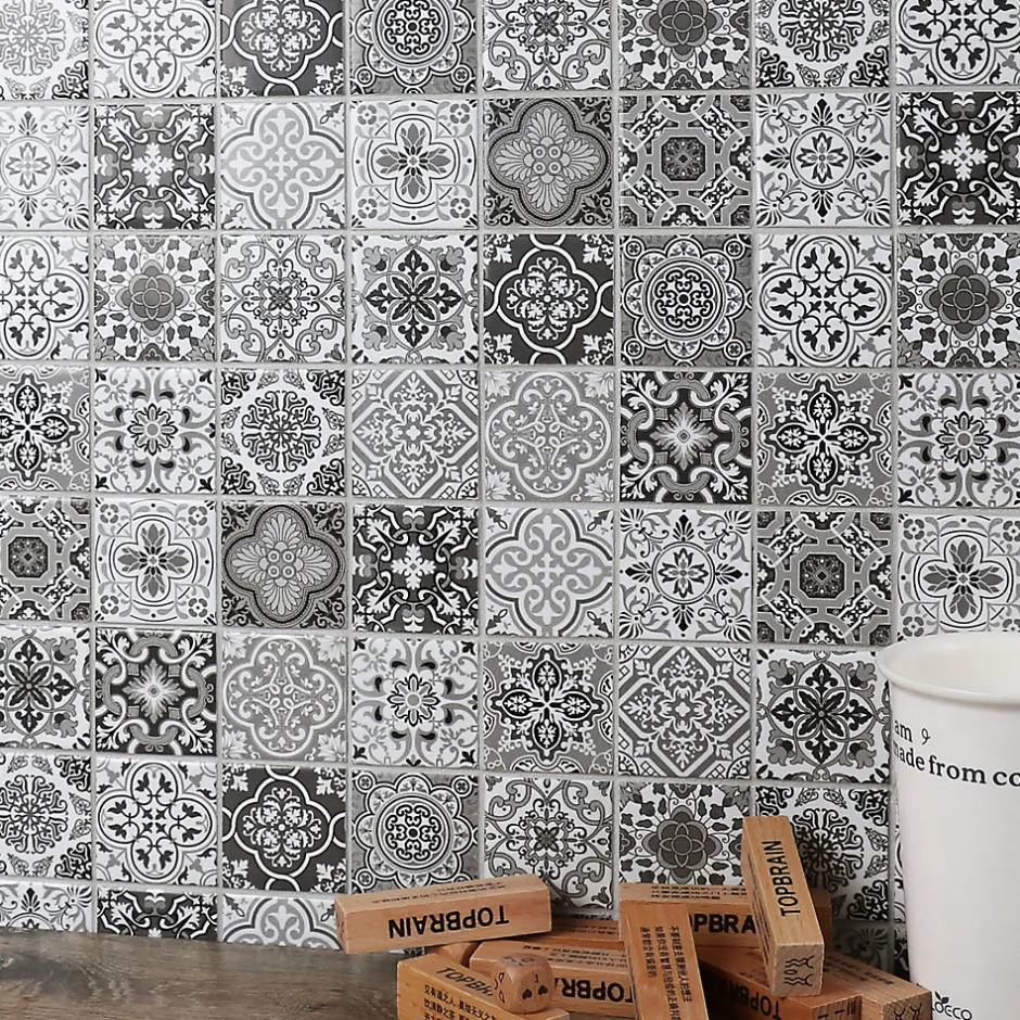 Transformez votre espace avec cette mosaique de céramique façon carreau ciment. Sa finition satinée et ses tons gris ajoutent charme et durabilité à votre cuisine ou salle de bain.
