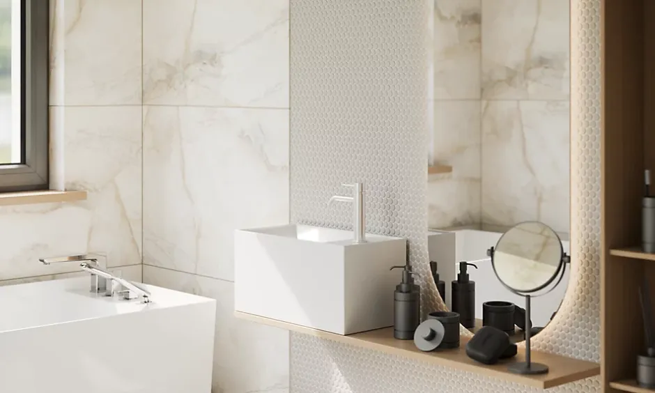 Mosaïque en céramique. Idéal pour une installation murale dans les espaces intérieurs de la maison, mais également excellent pour créer des bandes et/ou des inserts décoratifs car il est facile à couper grâce au maillage. Il s’adapte à toutes les surfaces, droites ou ondulées, également idéal pour les sols. La mosaïque est fournie sur un filet éco-plastique. Spécifications techniques : – Choix : Je ; – Antidérapant : non ; – Type de matériau : céramique (La découpe de la céramique est autorisée avec le disque céramique/carrelage.) ; – Dimensions de la plaque : 29.3cm x 31.7cm; – Taille de la carte : 1.9cm x 1.9cm; – Épaisseur : 5mm; – Quantité au m² : 11; – Résistant à l’eau ; – Résistant à la chaleur (convient aux saunas, spas et installation à proximité de sources de chaleur, par exemple poêles). Méthode d’installation :- Utilisez votre adhésif de montage spécifique préféré. – Appliquer le mastic époxy. – Laver l’excédent de mastic époxy avec une éponge douce et de l’eau. Traitement: La finition de surface permet un nettoyage facile avec un chiffon en microfibre, pour garantir la durabilité de la couleur dans le temps. Ne pas utiliser de produits abrasifs ou corrosifs. Ne pas frotter ni gratter. Élégance et facilité d’adaptation : La mosaïque en verre trempé se distingue par sa résistance à l’eau et à l’humidité, ce qui la rend parfaite pour une utilisation dans des environnements à forte humidité, tels que les salles de bains, les cuisines et les saunas. Il est idéal pour décorer les murs à côté des des baignoires et des douches. La finition en mosaïque s’intègre parfaitement aux designs modernes et minimalistes, ajoutant une touche d’élégance et de sophistication aux espaces.