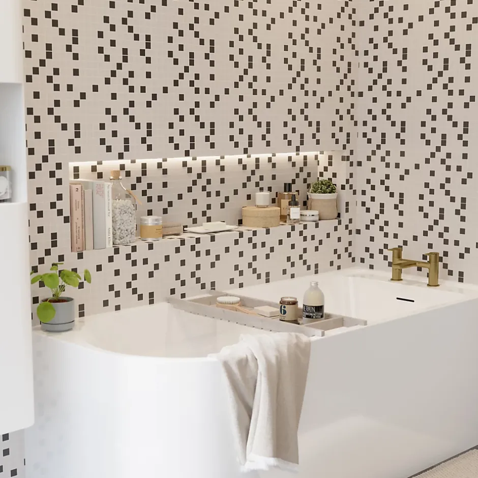 - élément de déco à part entière, ce produit peut s’accorder à un large éventail de carrelages muraux ; il peut être posé par dalles entières ou coupé pour créer des bordures décoratives