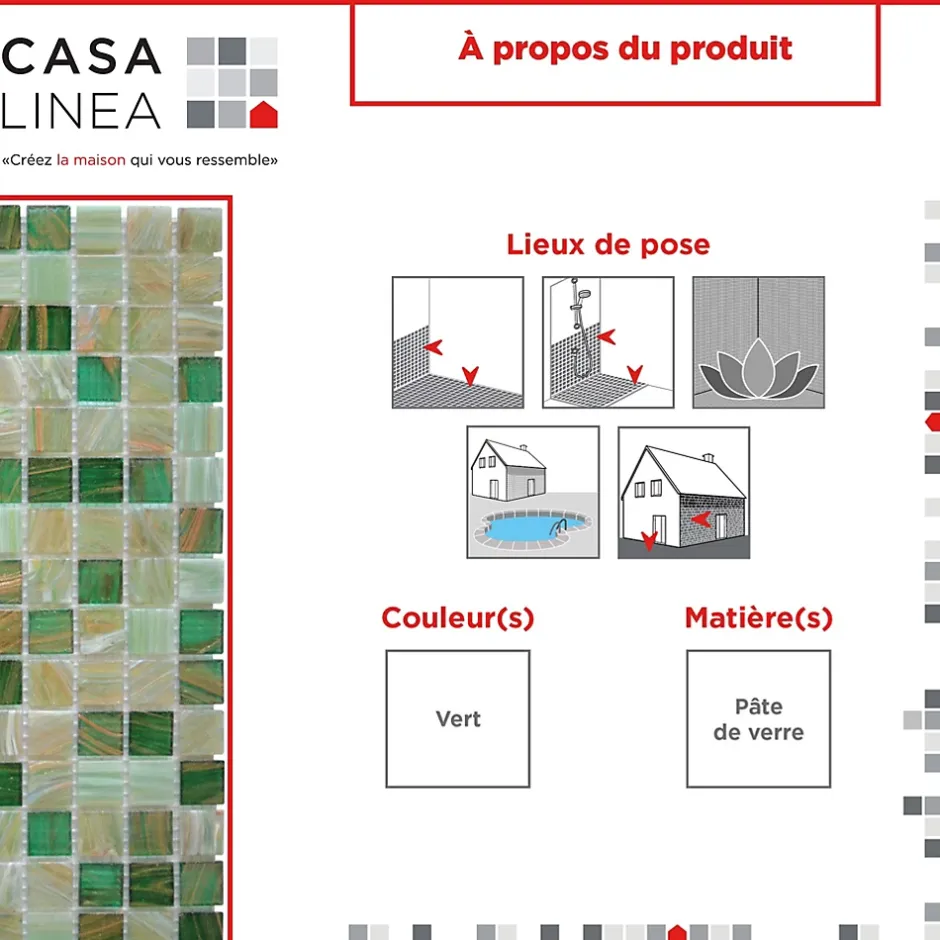 - Conçue pour les piscines, spas et salles de bain, cette mosaïque en pâte de verre est idéale pour les environnements humides.