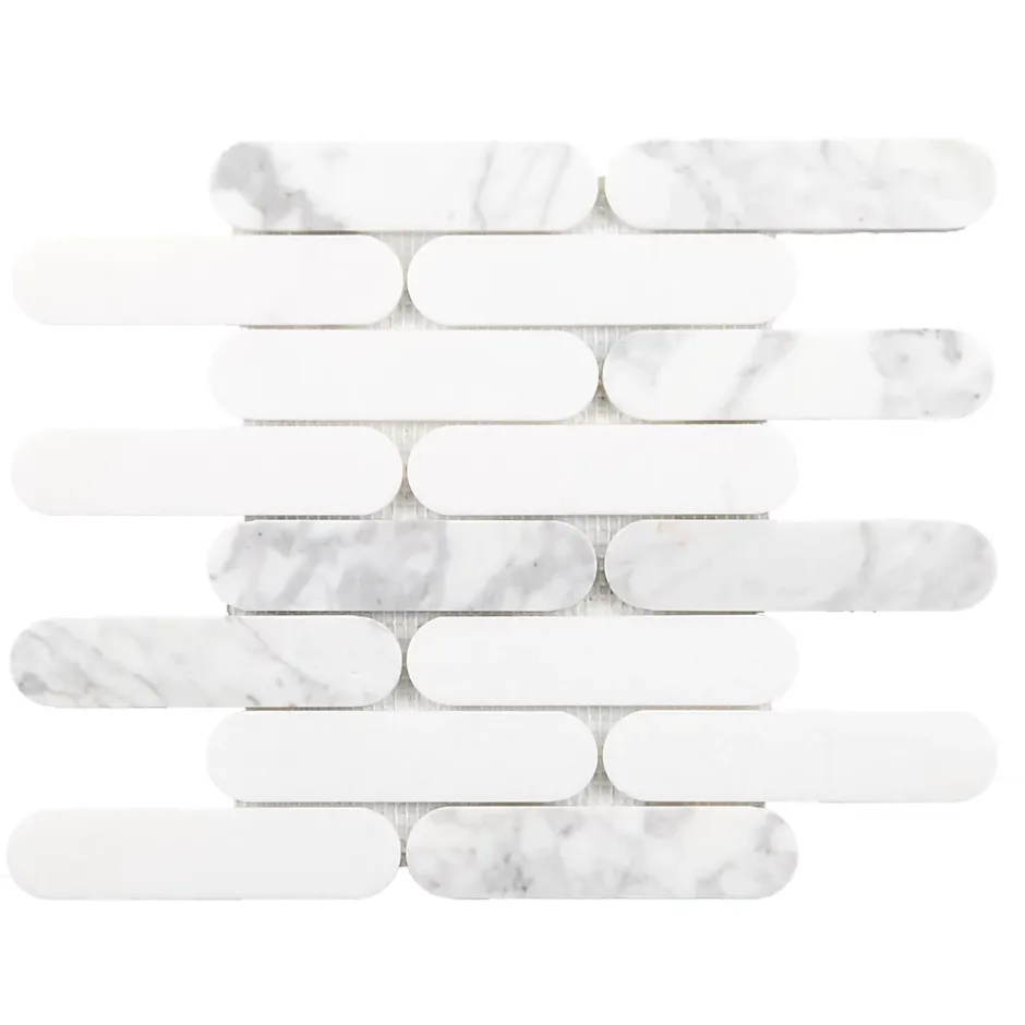 Feuille de mosaïque 300×290 de 6mm d’épaisseur en marbre carrare et thassos format « gélule ». Posée au mur ou au sol, elle est idéale pour la cuisine ou une douche à l’italienne