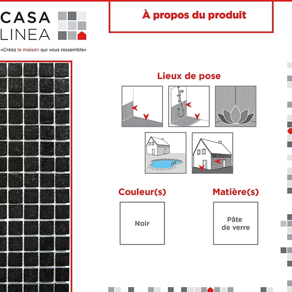 - Conçue pour les piscines, spas et salles de bain, cette mosaïque en pâte de verre est idéale pour les environnements humides.