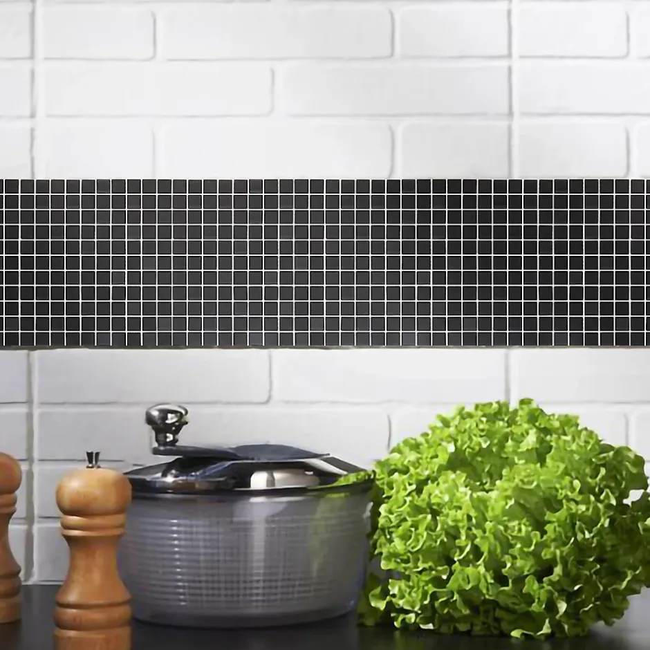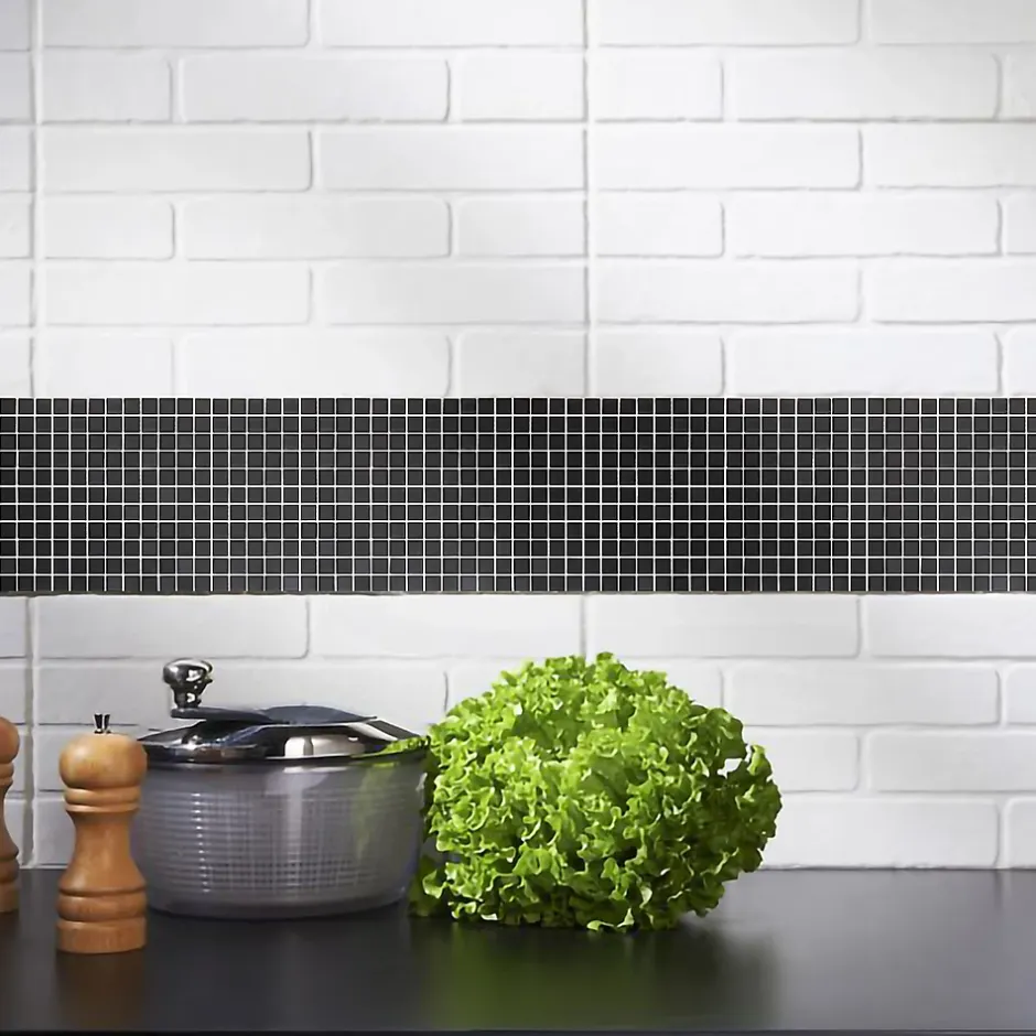 - élément de déco à part entière, ce produit peut s’accorder à un large éventail de carrelages muraux ; il peut être posé par dalles entières ou coupé pour créer des bordures décoratives
