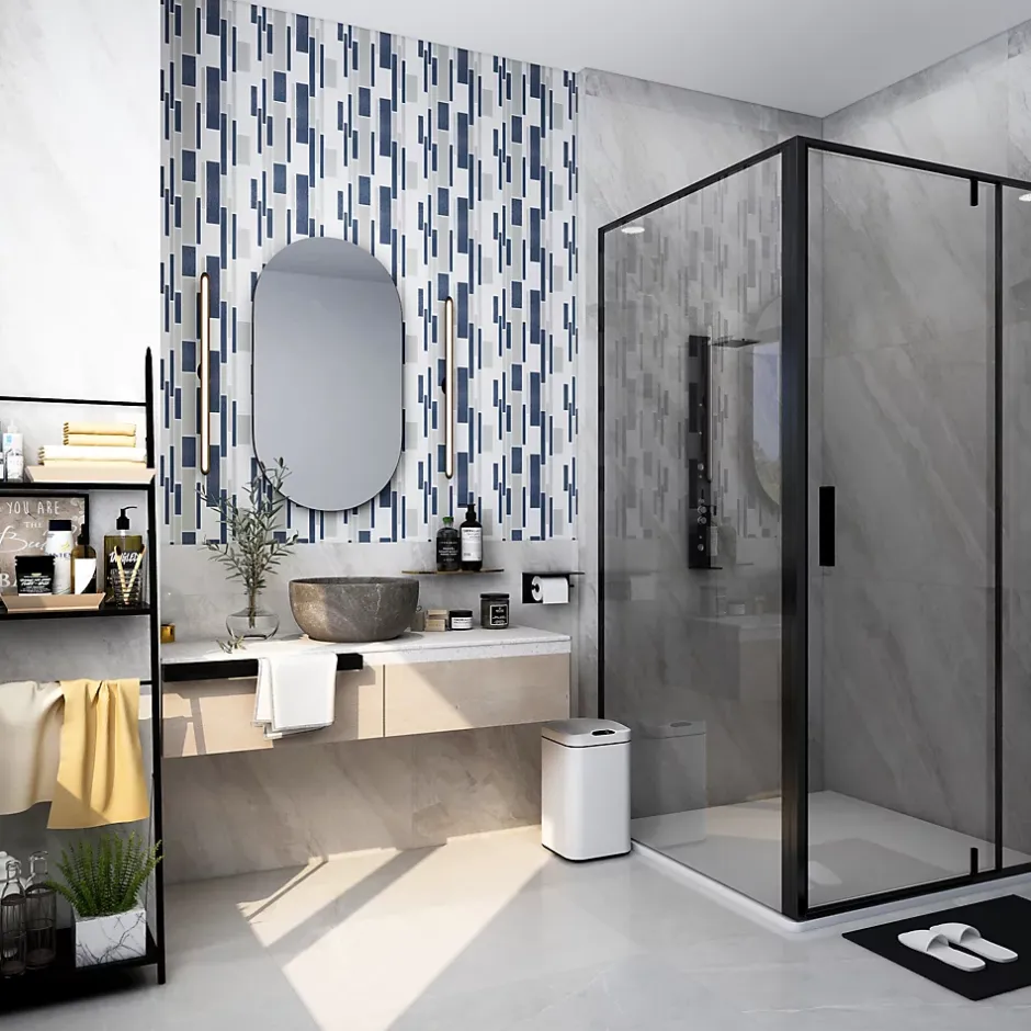 - Cette mosaïque peut être associée à un carrelage de couleur unie.