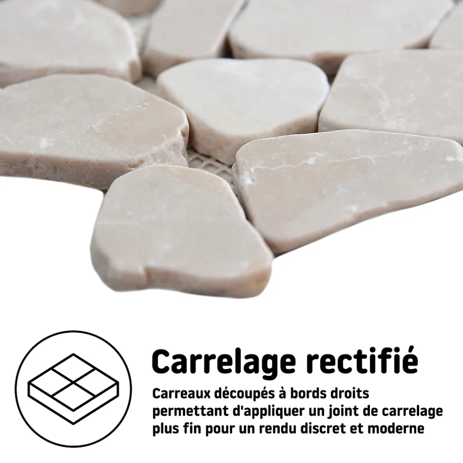 Les mosaïque Malaca en pierre naturelle (315 mm x 315 mm) offrent des nuances et textures variées pour des murs intérieurs personnalisés. Ces carreaux texturés apportent un fini haut de gamme, parfait pour habiller un mur unique ou en complément d’autres carreaux. Compatibles avec le chauffage au sol et conçues pour un usage multi-pièces intérieur, leur finition mate pierre naturelle apporte charme et authenticité. Ces mosaïques durables et élégantes transforment vos cuisines, salons ou couloirs en espaces sophistiqués, esthétiques et fonctionnels, avec un rendu harmonieux et moderne.