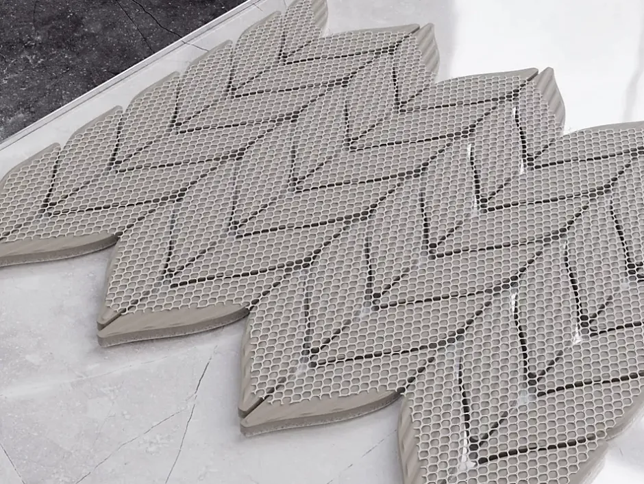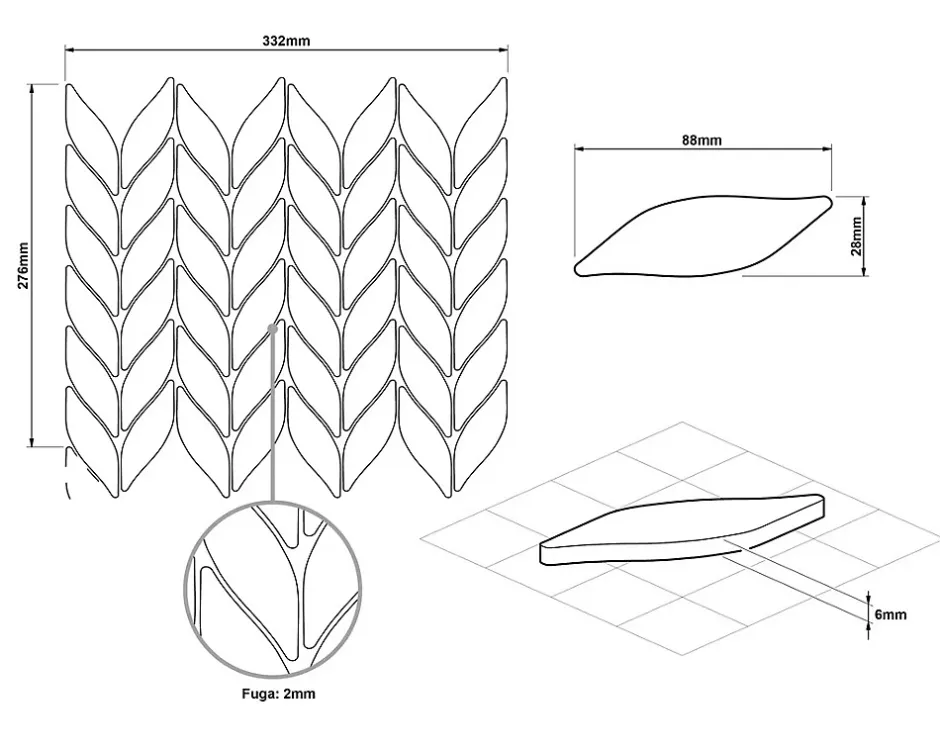 Céramique. Idéal pour une installation murale à l’intérieur, mais aussi excellent pour créer des bandes décoratives et/ou des inserts car il est facile à couper – Il s’adapte à toutes les surfaces, droites et ondulées, également idéal pour les sols. La finition de surface permet un nettoyage facile – L’épaisseur est de 6 mm. Dimensions de la plaque : 27.6cm x 33.2cm ; Nombre de plaques par 1 m² : 11 ; Certification : ISO 9001 : 2015. 1. Résistant aux hautes températures et aux rayures ; 2. Idéal comme doublure de bain ou de douche; 3. Facile à découper grâce à la maille éco-plastique.