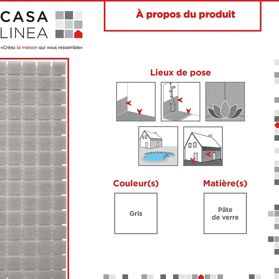 - Conçue pour les piscines, spas et salles de bain, cette mosaïque en pâte de verre est idéale pour les environnements humides.