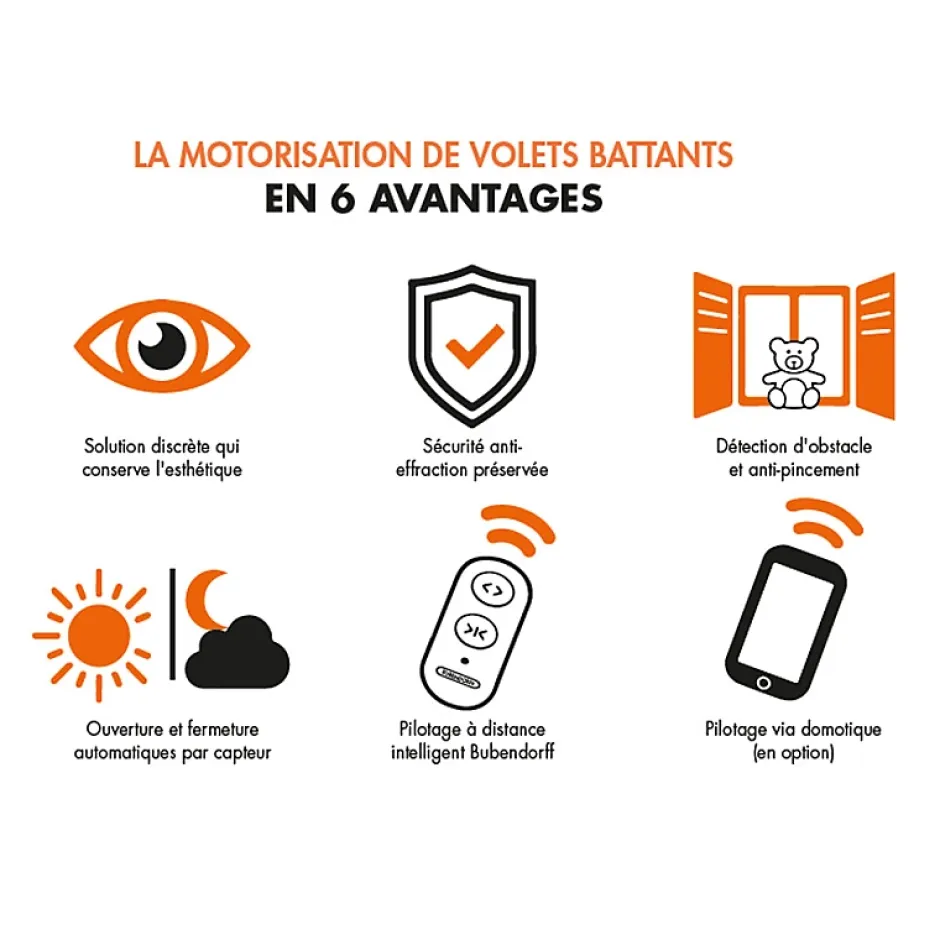 - Automatisation efficace : Profitez d’une motorisation discrète et performante qui permet d’actionner vos volets battants sans effort, via une télécommande ou un interrupteur mural.