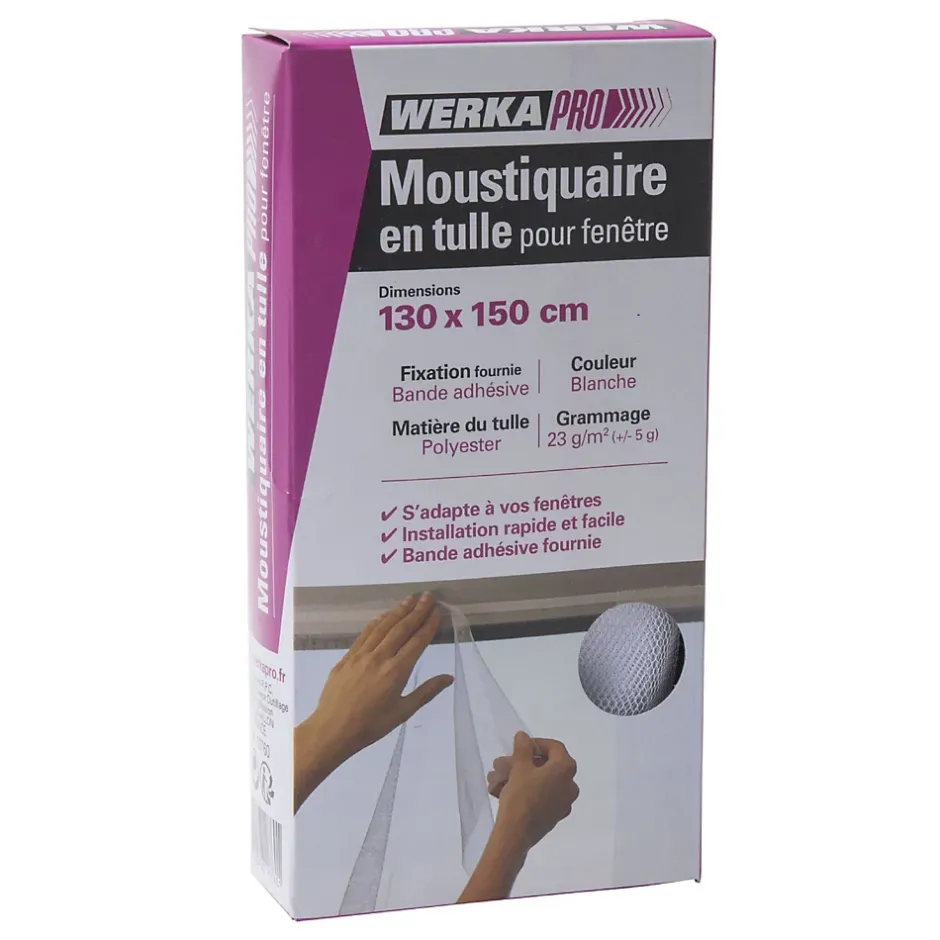Description détaillée du produit:Moustiquaire en tulleColoris du tulle: blanc Plusieurs dimensions disponibles Quantité: 1 panneauFixation: par bandes adhésives (fournies)Matière du tulle: polyesterGrammage du tulle: 23 g/m²(±5g)Marque: WERKA PRO