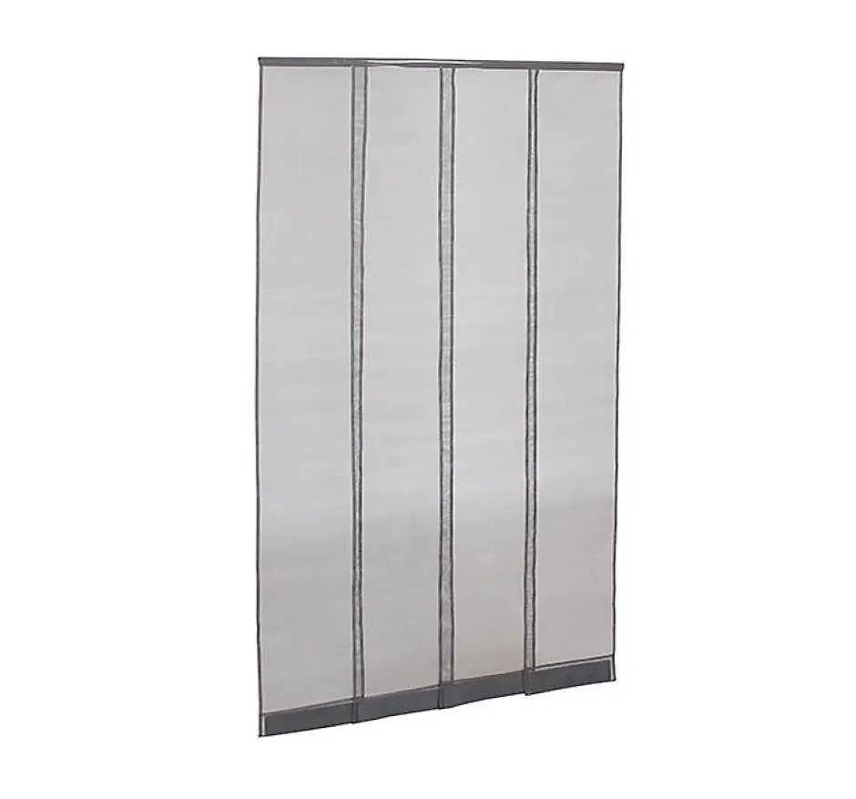 Caractéristiques de la Moustiquaire Rideau de Porte :Usage : porteFréquence : passage fréquentHauteur : 230 cmLargeur : 130 cmNombre de bandes : 4Largeur d’une bande : 34 cmDimensions du profil supérieur : 130 x 2.3 x 0.5 cmMatériau du profil supérieur : PVC Matériau de la moustiquaire : fibre de verre enduite de PVC Couleur du profil supérieur : grisCouleur de la moustiquaire : grisePose : Fixation adhésive sans perçageRecoupable : oui, hauteur et largeurRemise en place des bandes : automatiquesLestage des bandes : ouiCompatibilité support : tous hormis le PVCFixation du rideau pour porte simple et rapide :Le haut de chaque bande est à disposer à l’intérieur du rail ouvert. Vous refermez simplement ce rail dessus afin de les pincer solidement. Sa couleur est assortie à la couleur de la toile.Compatibilité animaux :La Toile Moustiquaire n’est pas faite pour résister aux griffures de chats et chiens, néanmoins, ce type de Moustiquaire pour Porte, avec ses bandes qui se remettent en place seule, est parfaitement adapté aux animaux. Vos chats et chiens pourront en effet se déplacer de l’intérieur vers l’extérieur et vice versa de façon autonome.