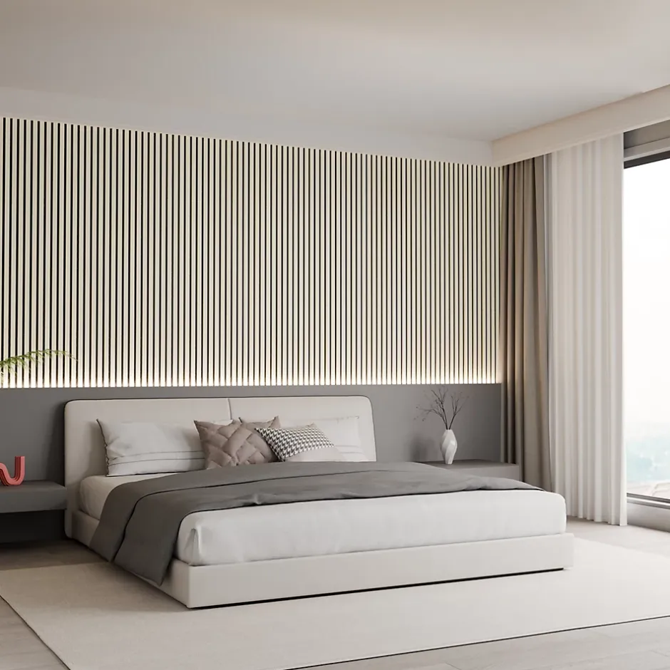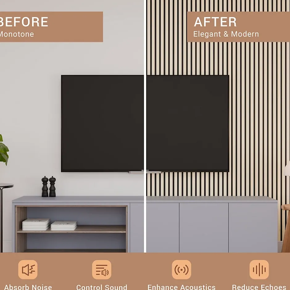 Alliant performance acoustique et esthétique contemporaine, nos panneaux acoustiques souples constituent une solution idéale pour améliorer le confort sonore de vos espaces tout en apportant une finition décorative soignée.Caractéristiques techniques :Dimensions : 240 cm x 60 cmÉpaisseur : 1,1 cmSurface couverte : 1,44 m² par panneauPoids : 5 kgMatériaux : feutrine + lattes MDF plaquéesFixation : colle silicone ou visUtilisation : isolation et traitement acoustiqueCompatibilité : tous types de pièces (habitation, bureau, usage professionnel)Structure et matériauxLes panneaux se composent de deux couches principales :Une base en feutrine acoustique permettant une absorption efficace des sons et une réduction des nuisances sonores.Une finition en lattes de MDF (fibre de bois à densité moyenne), recouvertes d’un placage esthétique et résistant, offrant un rendu élégant et durable.Amélioration acoustiqueGrâce à leur structure multicouche, ces panneaux réduisent efficacement les résonances et réverbérations. Ils sont adaptés à de nombreux environnements : bureaux, studios, open-spaces, salons, salles de réunion ou home cinéma.Installation simple et rapideLeur conception légère (5 kg) permet une pose facile sur murs ou plafonds à l’aide de colle silicone ou de vis. Aucun encadrement spécifique n’est nécessaire.Découpe conseillée : pour ajuster les panneaux aux dimensions souhaitées, l’utilisation d’une scie circulaire est recommandée afin d’obtenir une coupe nette et précise.EntretienDépoussiérage à l’aide d’un balai ou d’un aspirateur avec embout douxEn cas de taches : chiffon propre, humide et bien essoréÉviter les produits abrasifs