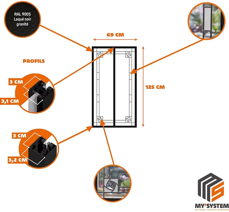 MySystem Verrière 2 verres Mackintosh – L x H : 69 x 125 cm – Laqué noir 9005 granité – verre Sahara inclus