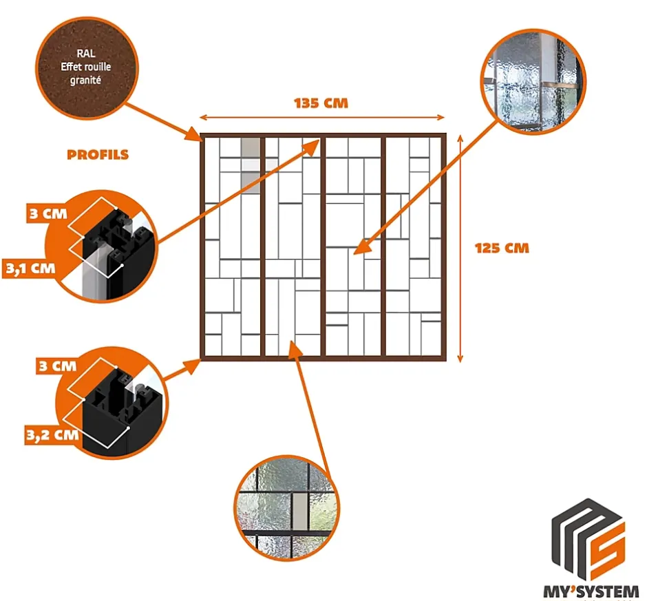 MySystem Verrière 4 verres Chicago – L x H : 135 x 125 cm – Laqué effet rouille granité – verre Sahara inclus