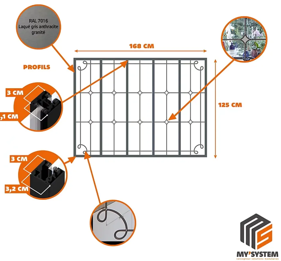 MySystem Verrière 5 verres Curly – L x H : 168 x 125 cm – Laqué gris 7016 granité – verre Sahara inclus