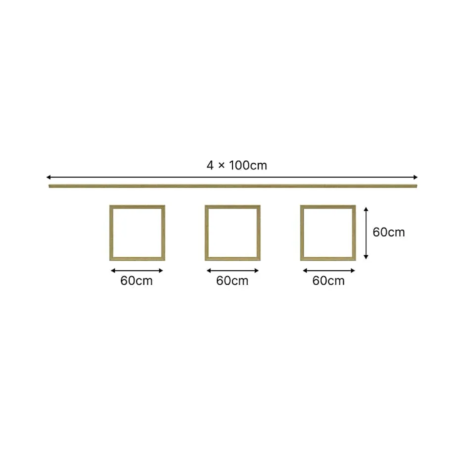Kit pour habiller un mur de 200 à 400 cm de longueur avec des moulures en bois. Moulures prédécoupées pour former des encadrements et prêtes à poser avec un simple filet de colle. Lors de la pose, veillez à laisser un espace vide identique entre chaque encadrement pour équilibrer les espacements. Le kit se compose de :3 x Kit moulure 60 x 60 cm4 x Moulure droite 100 cm