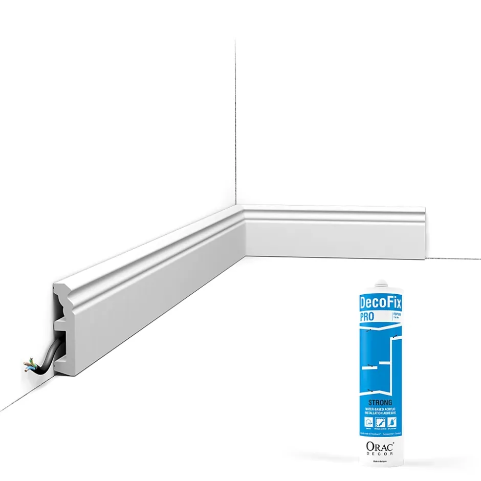 La SX195 est une plinthe intemporelle, elle est fine et élégante et s’adaptera aux petites pièces sans trop de hauteur sous plafond. Couleur: blanc, facile à peindre Matériau: duropolymer (un polymère extrudé résistant aux impacts) Une boîte de découpe est nécessaire pour la découpe d’angle La plinthe Orac se peint directement à la peinture acrylique Peut remplacer une goulotte dans certains cas Vendue à l’unité