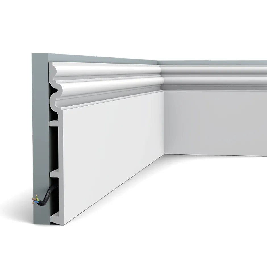 La SX193 fait partie de la gamme AUTOIRE c’est la plus grande plinthe du catalogue Orac Decor, elle s’intégrera parfaitement dans une salle de réception, un grand salon ou même une spacieuse entrée. Il faudra tout de même avoir au moins 3 mètres de hauteur sous plafond pour qu’elle soit à son avantage. Profondeur utile : 1,4 cm Hauteur utile : 7 cm + 6,7 cm Couleur : blanc, facile à peindre Matériau : duropolymer (un polymère extrudé résistant aux impacts) Découpe facile à la longueur souhaitée Une boîte de découpe est nécessaire pour la découpe d’angle La plinthe Orac se peint directement à la peinture acrylique Peut remplacer une goulotte dans certains cas Vendue à l’unité