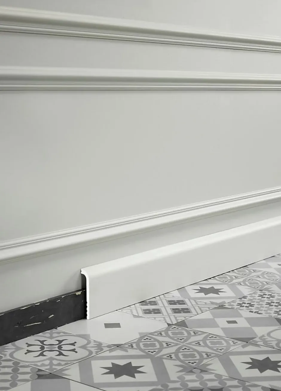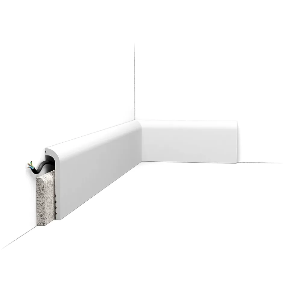 Couleur: blanc, facile à peindre Matériau: duropolymer (un polymère extrudé résistant aux impacts) Une boîte de découpe est nécessaire pour la découpe d’angle La plinthe Orac se peint directement à la peinture acrylique Peut remplacer une goulotte dans certains cas Vendue à l’unité