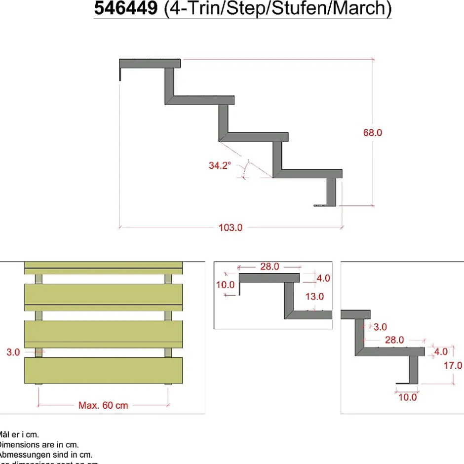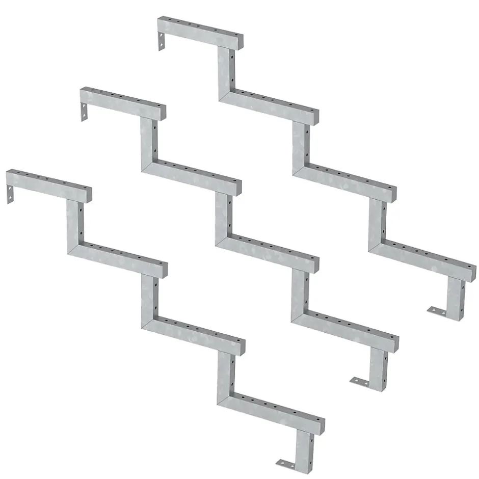Pack 3 pièces – Limon acier galvanisé 4 marches – H 68cm Vous souhaitez créer vos propres escaliers de terrasse avec des limons d’escaliers en acier galvanisé à chaud pour votre terrasse ou simplement pour compenser une différence de hauteur dans votre espace extérieur ?Apportez une touche esthétique moderne et industrielle à votre jardin. Alors vous pouvez utiliser nos nouveaux limons d’escalier très pratiques ! Les limons en acier sont disponibles dans les tailles de 2, 3, 4, 5, 6, 7 et 8 marches et le nombre nécessaire dépend de la largeur de vos escaliers. Placez les limons d’escalier à une distance maximale de 60 cm et fixez les planches en bois dessus. Pour les marches en bois, nous recommandons nos marches en bois autoclave classe 4.Épaisseur des limons : 3 cmProfondeur des marches : 28 cmHauteur des marches : 17 cmEn acier galvanisé à chaud2 marches : hauteur 34 cm, emprise au sol 53 cm3 marches : hauteur 51 cm, emprise au sol 78 cm4 marches : hauteur 68 cm, emprise au sol 103 cm5 marches : hauteur 85 cm, emprise au sol 128 cm6 marches : hauteur 102 cm, emprise au sol 153 cm7 marches : hauteur 119 cm, emprise au sol 178 cm8 marches : hauteur 136 cm, emprise au sol 203 cmLivré sans vis en acier ni planches en bois pour les marches.Les limons en acier galvanisé ne peuvent pas être fabriqués sur mesure.Nous recommandons le nombre suivant de limons d’escalier pour construire vos propres escaliers de terrasse :Largeur des marches en bois 60 à 100 cm : 2 limons en acierLargeur 120 à 160 cm : 3 limons en acierPour chaque largeur supplémentaire de 60 cm, un limon supplémentaire doit être placé.