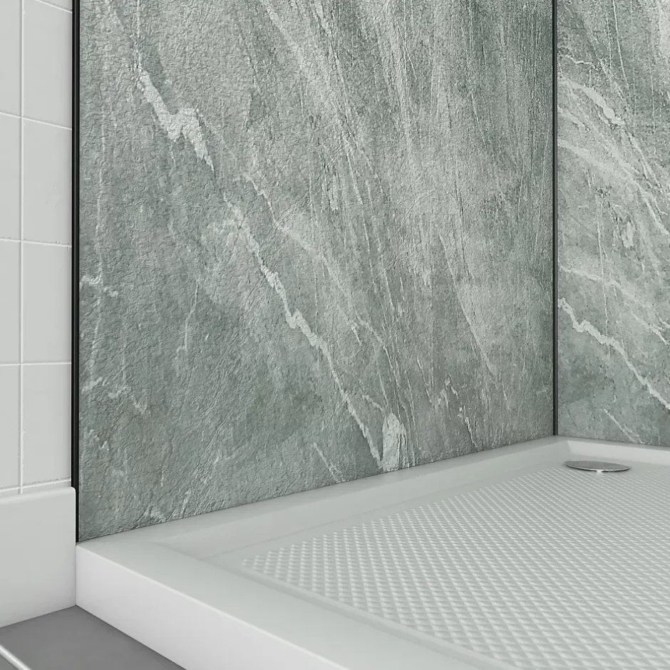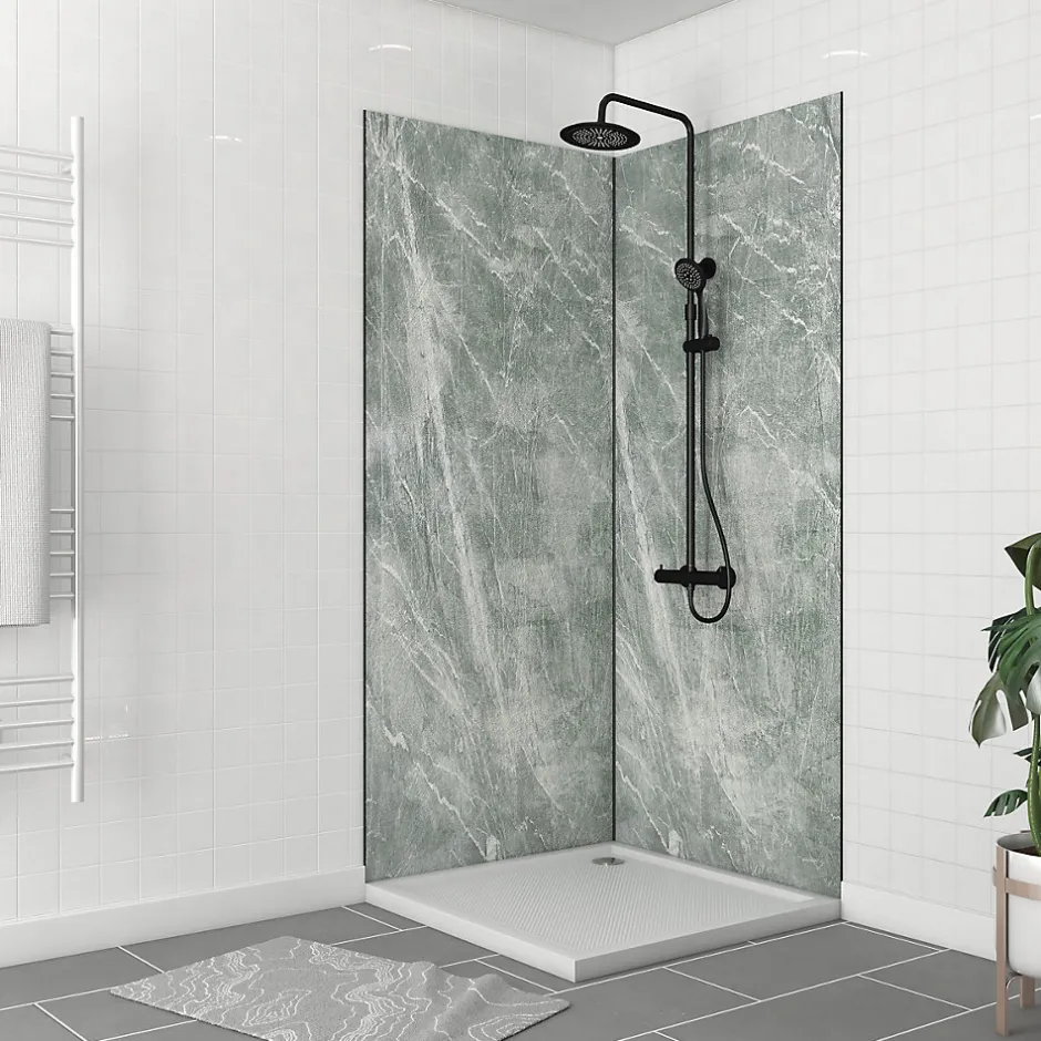 Pack de 2 panneaux muraux de salle de bains, vert effet pierre avec profilés noirs, l.90+90 x H.210 x P.0,3 cm, Galedo Homestone