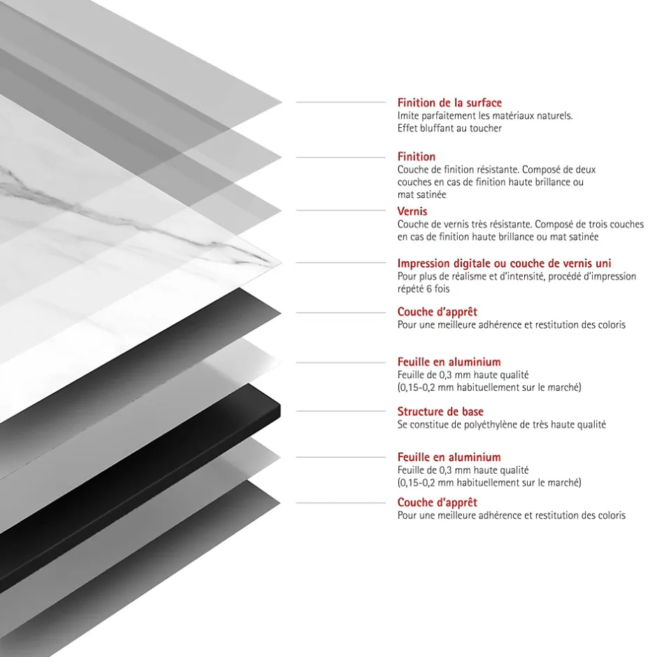 - RÉSISTANT : revêtement en aluminium composite 9 couches. Plaque résistante aux UV, chocs, rayures et à une chaleur allant jusqu’à 100° C. Ne décolore pas. Garantie 10 ans.