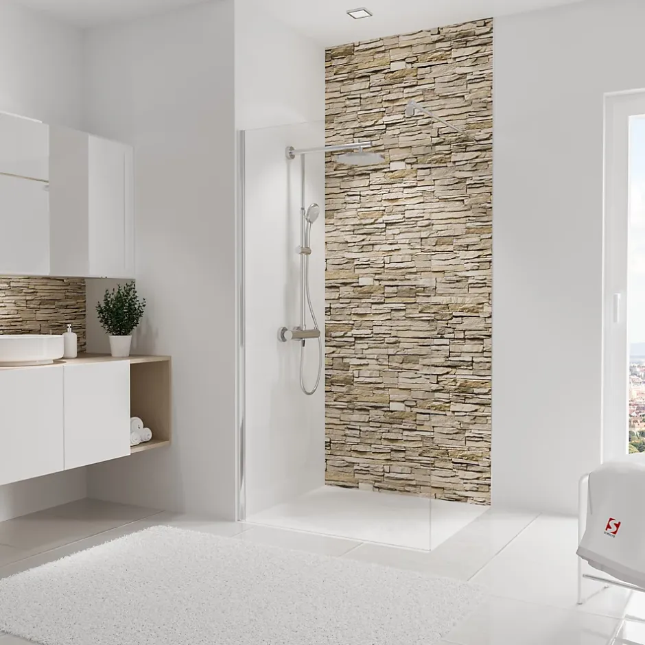 Panneau mural de salle de bains l.100 x H.255 cm, effet parement pierre beige, Schulte DécoDesign