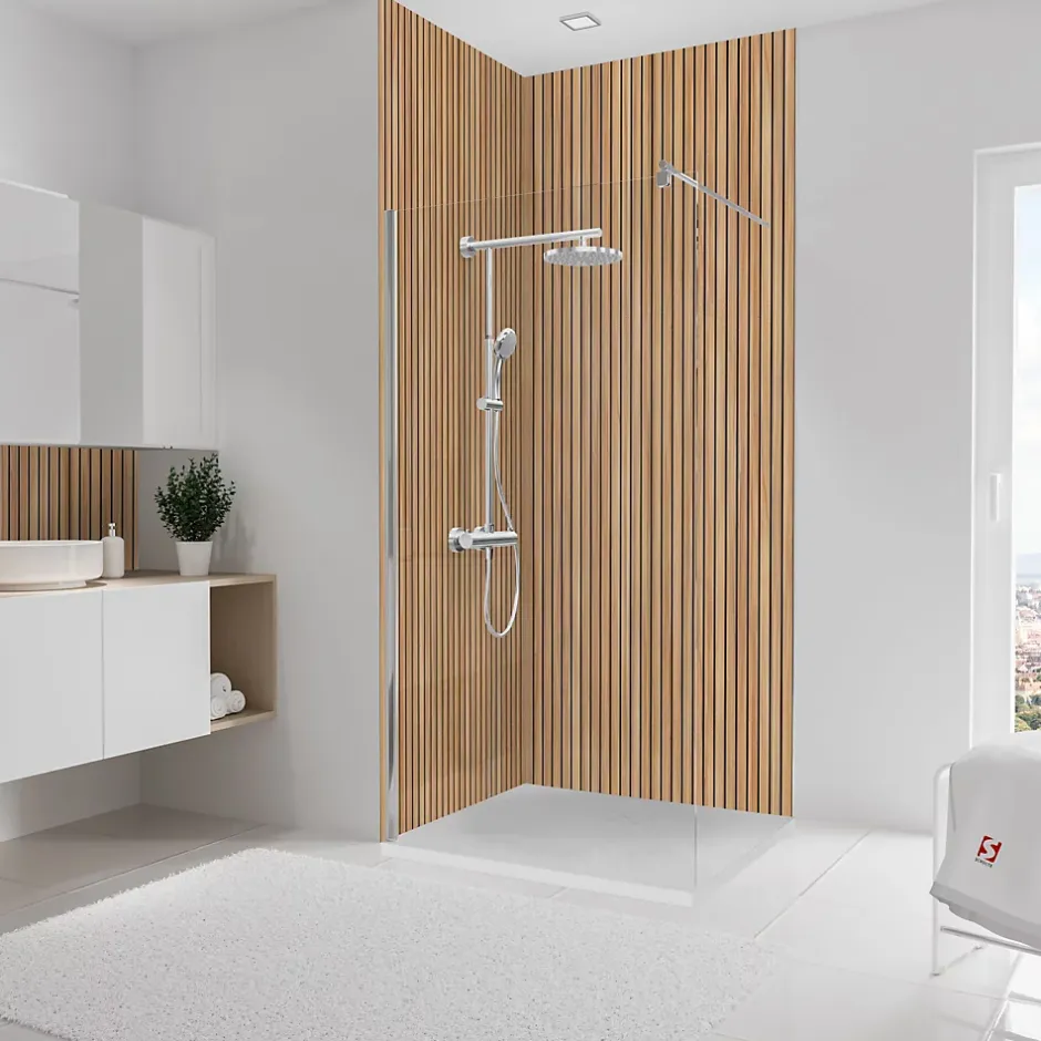 Lot de 2 panneaux muraux de salle de bains l.100 x H.255 cm, effet lamelles bois chêne vertical, Schulte DécoDesign Japandi