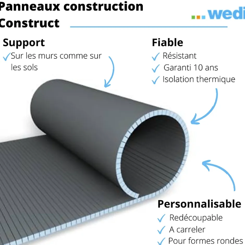Les avantages de vos panneaux de construction circulaire WediComposition : le panneau de construction wedi est en mousse rigide de polystyrène extrudé sans HCFC (gaz à l’origine de la déstruction de la couche d’ozone)Support : constitue une base idéale pour le carrelage de tout type.Application : il peut être appliqué sur presque tous les supports.Etanche : totalement imperméable et isolant.Installation : grâce à sa fabrication il est léger et solide, pour une installation facilitée.Personnalisable : toutes les possibilités s’offrent à vous pour la réalisation de formes circulaires et personnalisées.Adaptable : grâce aux rainures longitudinales et transversales prédécoupées en usine, votre panneau de construction circulaire donne libre court à votre imagination. Les rainures sont disposées horizontalement ou verticalement en fonction du demi-cercle voulu. Voir photo.Réalisation : il est possible de réaliser des courbes avec un rayon faible ou bien des solutions en demi-cercle.Les caractéristiques techniques de votre panneau de construction ConstructDimensions : 250 x 60 x 3 cm, transversalSystème complet 100% étancheSystèmes déjà étanches et prêts à carrelerPoids léger, grande stabilitéMatériau isolant thermique pour économiser d’énergieProtection durable contre l’humidité et les moisissuresTraitement rapide et simple – durabilité assuréeCertifié abP
