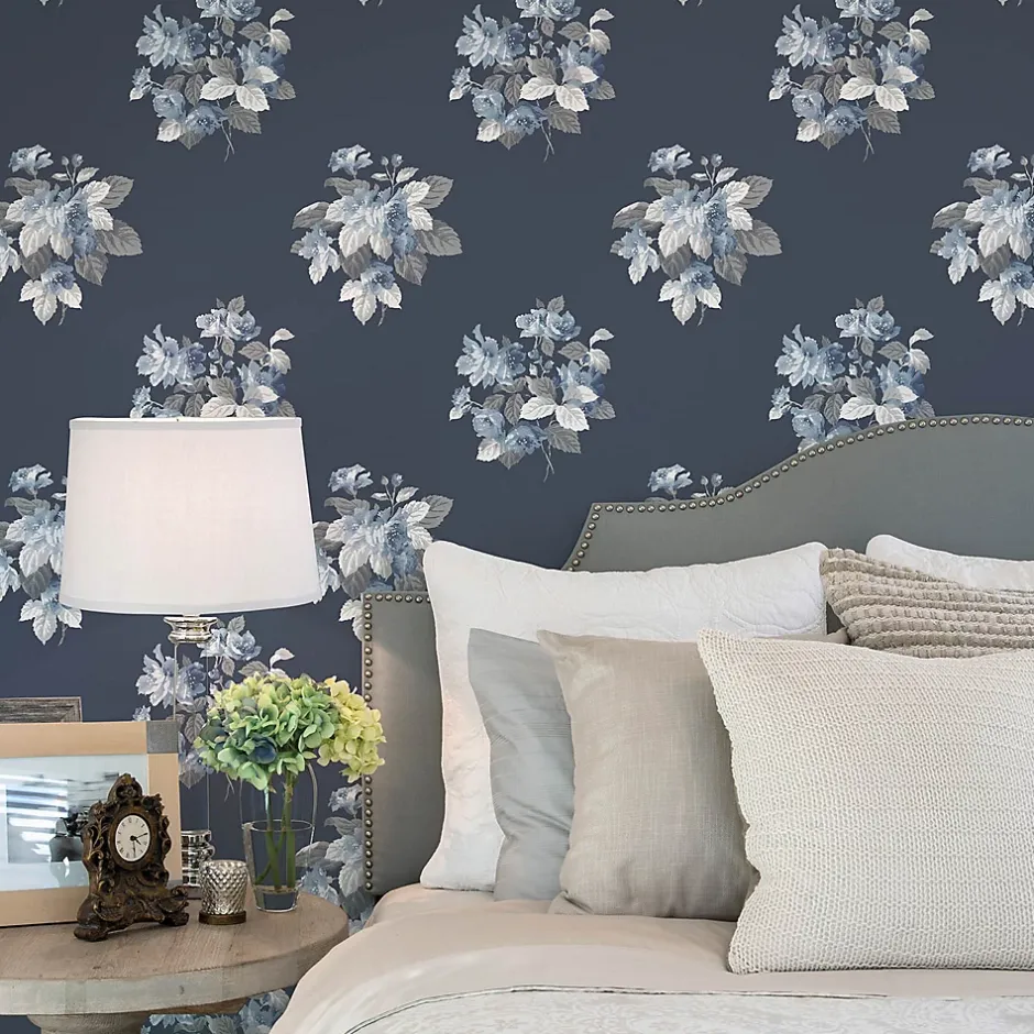 Papier peint intissé Jardin Secret Lutece mat et satiné fleurs bleu, bleu nuit l.1000 x l.53 cm