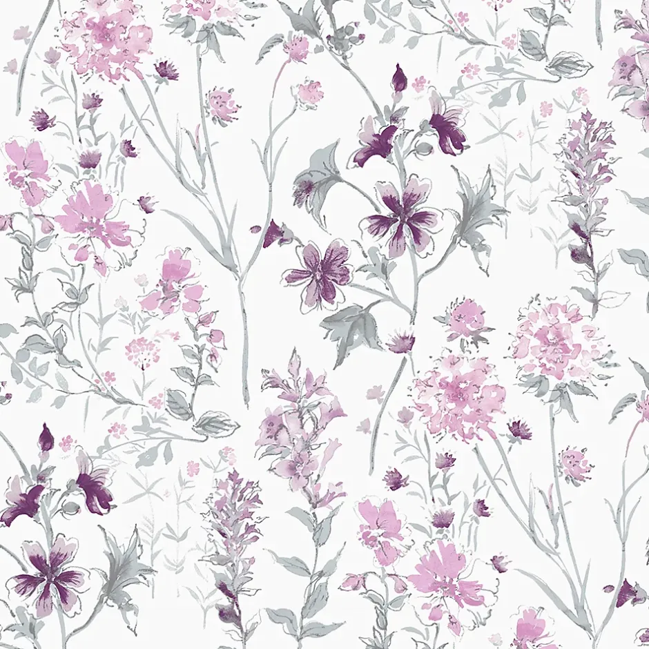 Papier peint intissé Wild meadow imprimé fleurs iris blanc, violet L.1000 x l.52cm Laura Ashley